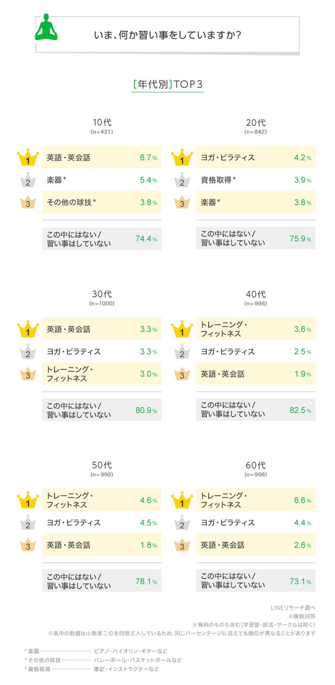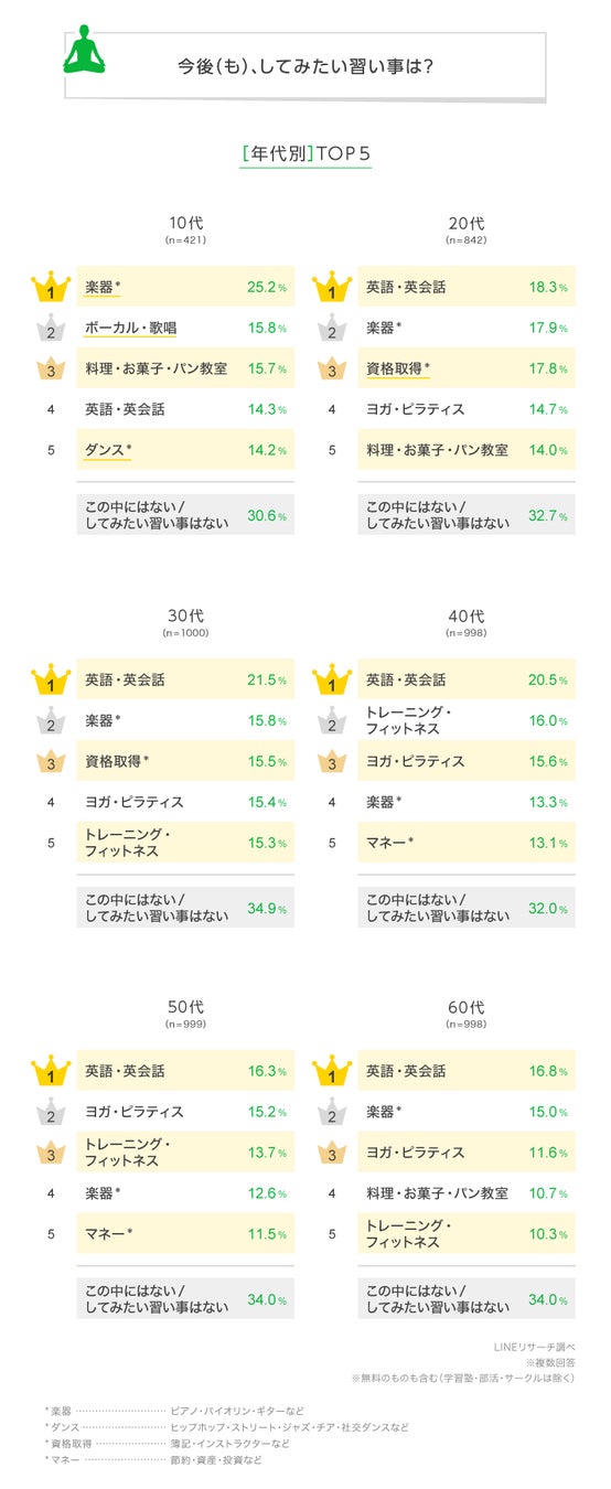 【LINEリサーチ】今後してみたい習い事の1位は「英語・英会話」、「楽器」「ヨガ・ピラティス」も上位にランクイン