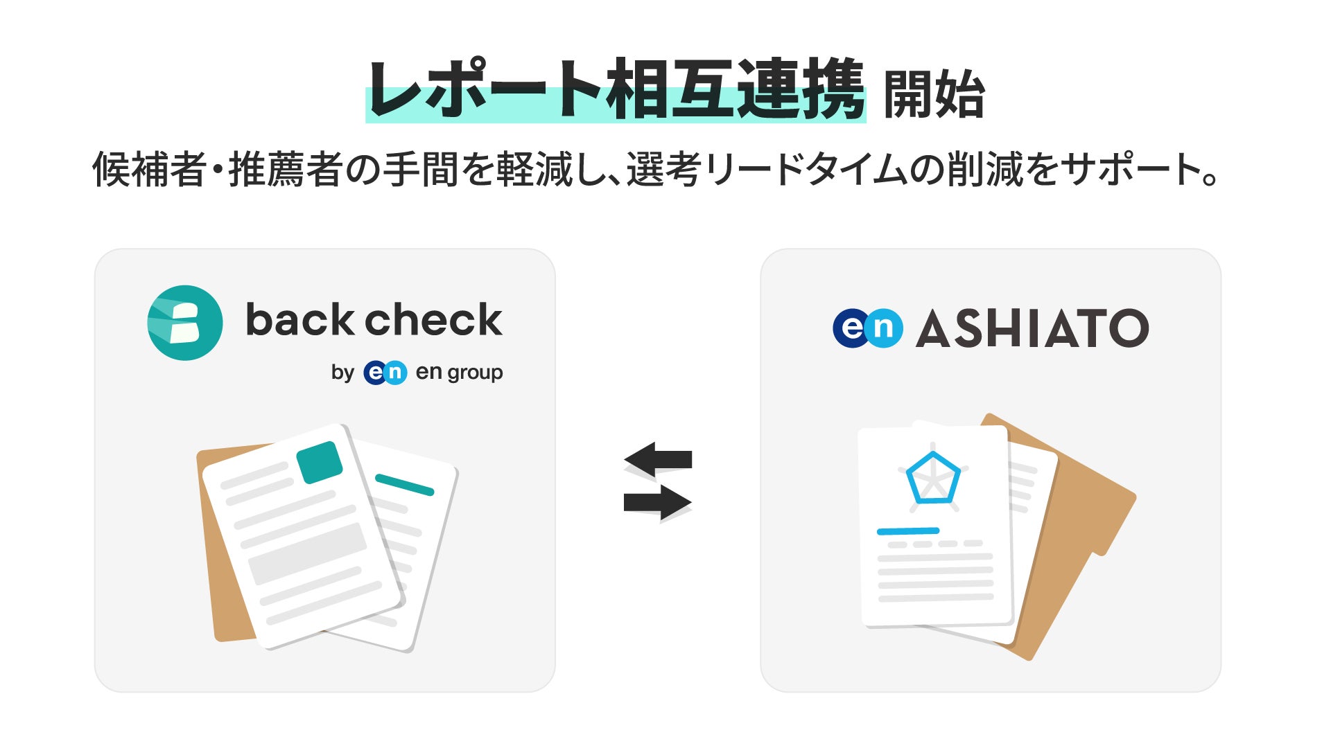 back check株式会社(本社:東京都新宿区、代表取締役:須藤 芳紀、エン株式会社100%出資)が提供する、オンライン完結型リファレンスチェックサービス『back check』(https://site.backcheck.jp/)および、『ASHIATO』(https://ashiatohr.com/)では、サービス間のリファレンスレポート相互共有の取り組みを開始しました。本取り組みは、エングループ内におけるサービス連携の一環として実施するものです。