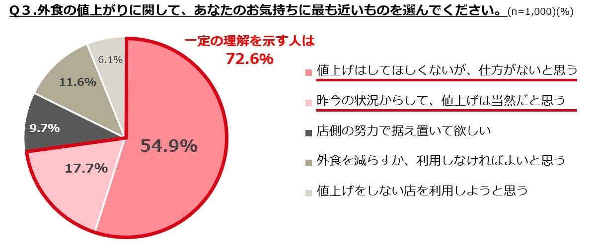 ・外食の値上げは「仕方がない」が55%、「値上げは当然」が18%と、7割以上の人が理解を示す。