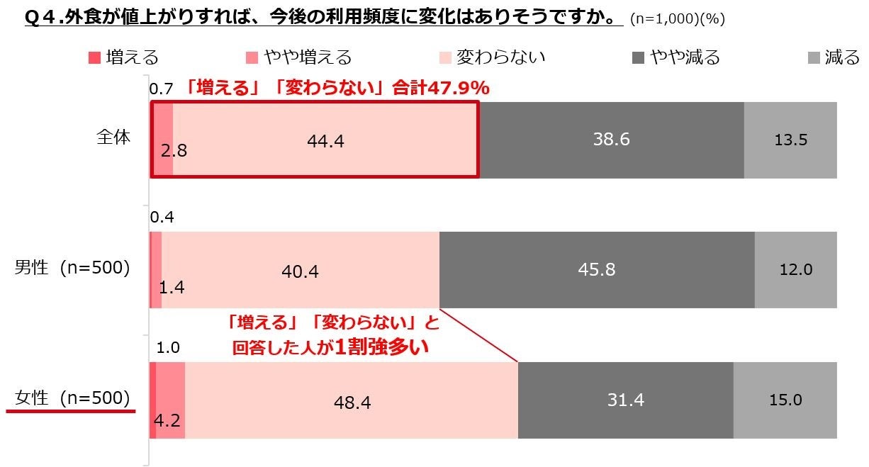 ・値上げによる利用頻度は「増える」「変わらない」と「減る」と回答した人はほぼ等しい結果に、男性より女性の方が「増える」「変わらない」を合わせた回答の割合が約1割強高め。