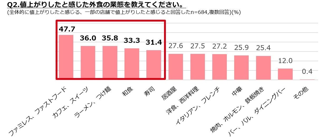 ・値上がりしたと感じる業態は「ファミレス、ファストフード」が半数弱で最も多く、「カフェ」「ラーメン」「和食」「寿司」は3割以上。