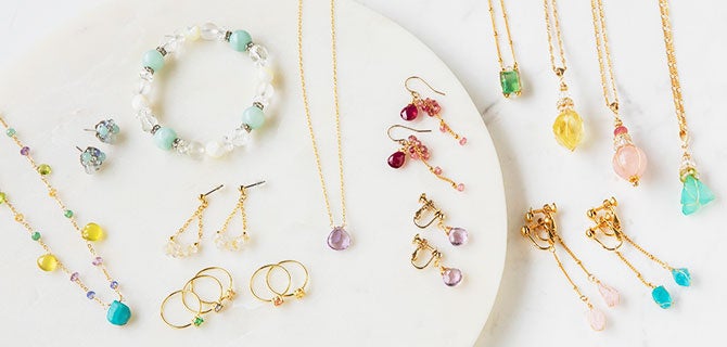 本物の石を使うので、デパートやショップの売り物のような素敵なアクセサリーをご自分で作ることができます。身につけやすいシンプルなデザインと本物の輝きが日常のおしゃれをランクアップ!誕生石のリングや石言葉を添えたネックレスは、大切な方へのプレゼントにも喜ばれます。