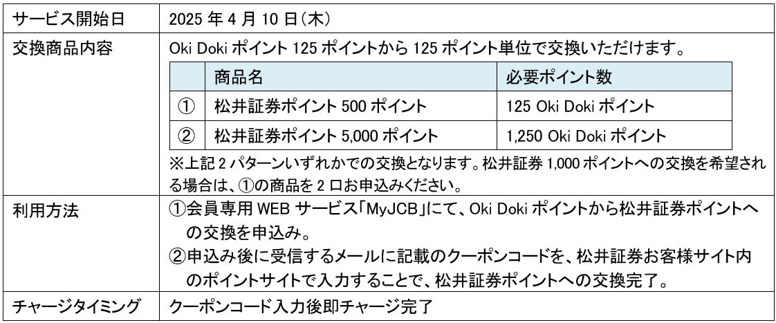 株式会社ジェーシービー (本社:東京都港区、代表取締役兼執行役員社長:二重 孝好、以下:JCB)と、松井証券株式会社(本社:東京都千代田区、代表取締役社長:和里田 聰、以下:松井証券)は、2025年5月下旬に予定しているクレカ積立サービスの開始に向けて、JCBのOki Dokiポイントから松井証券ポイントへの交換サービスを、2025年4月(予定)より開始することをお知らせします。