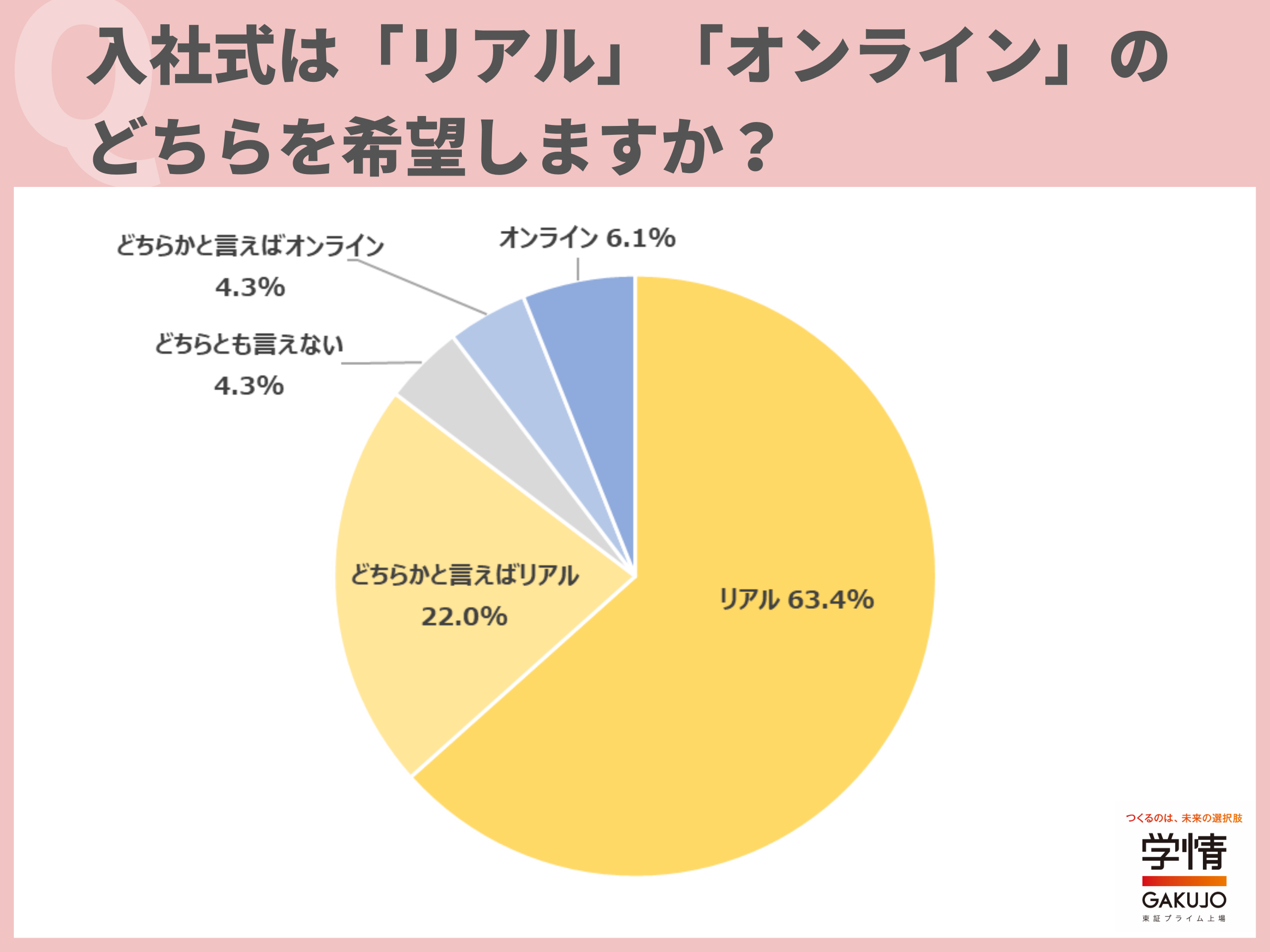 入社式は「リアル」で参加したいと回答した新社会人が63.4%でした。「どちらかと言えばリアル」22.0%を合わせると、「リアル」での参加を希望する新社会人が85.4%に上ります。「リアル」での参加を希望する割合は、前年比15.5ポイント増加しました。「同期と直接話したい」「入社するという実感を持ちたい」「職場の雰囲気を掴みたい」「直接コミュニケーションを図りたい」「リアルのほうが顔と名前が一致すると思う」といった声が寄せられています。
