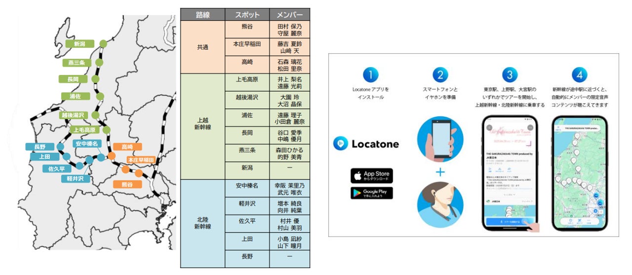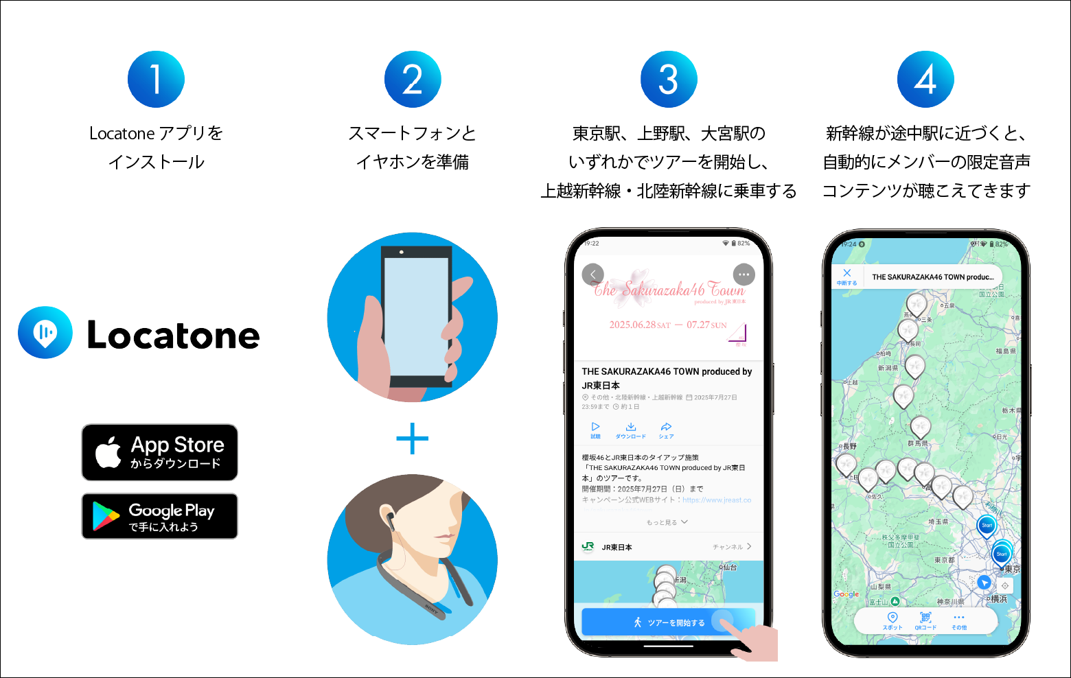 期間中、上越新幹線・北陸新幹線に乗車すると、音声ARアプリ「Locatone ™(ロケトーン)」を利用して新幹線車内限定で楽しめる櫻坂46のメンバー24名の音声コンテンツを体験できます。