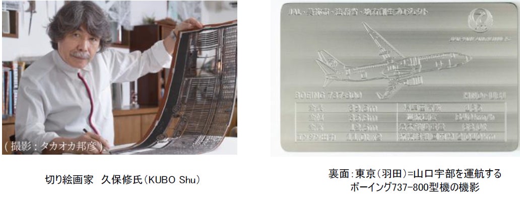 表面のデザインは、美祢市ふるさと交流大使で世界的な切り絵画家・久保修氏が担当し、美祢市の観光名所である秋芳洞の風景が描かれています。裏面は、東京(羽田)=山口宇部を運航するボーイング737-800型機の機影を刻印しました。