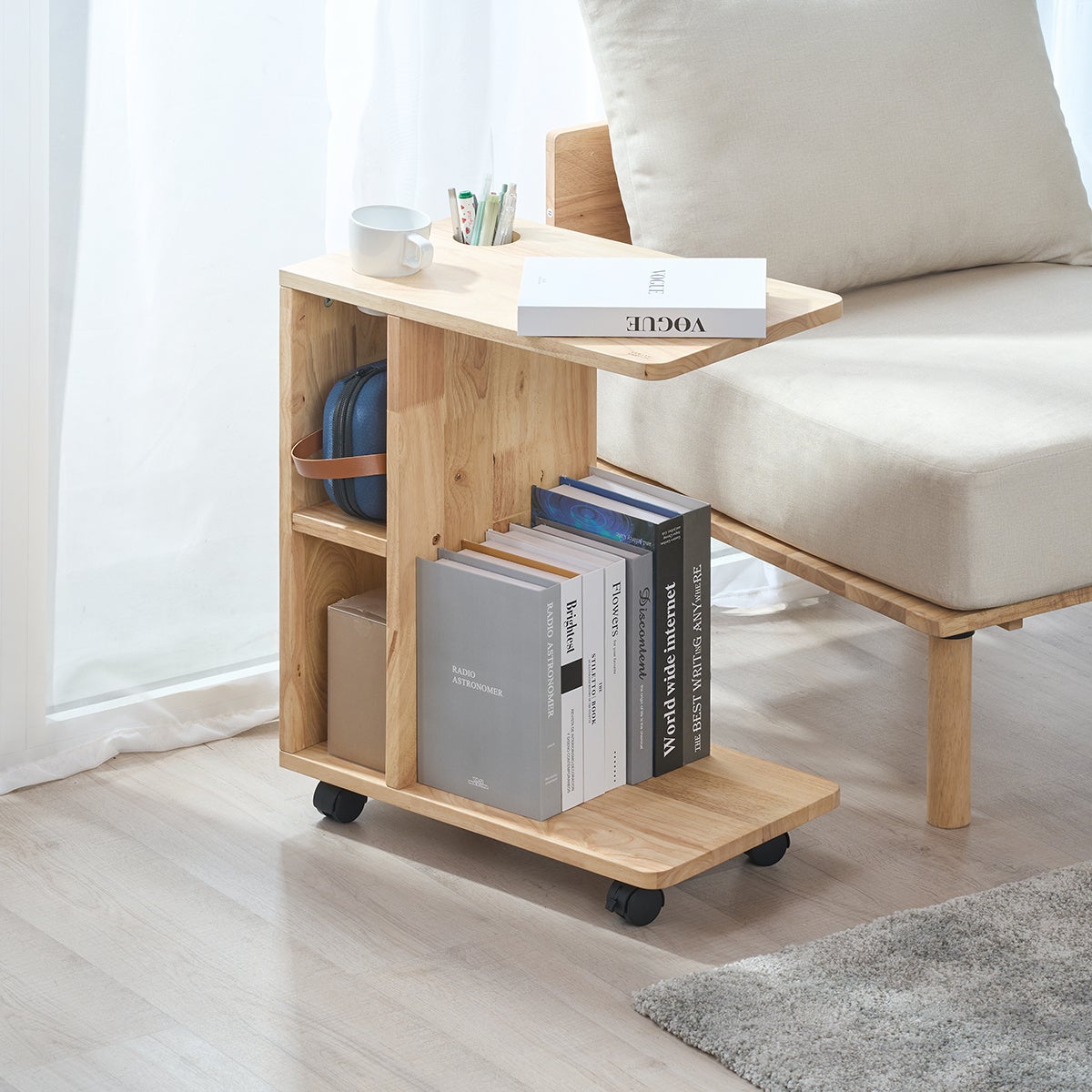 天然木が美しいキャスター付きサイドテーブル。