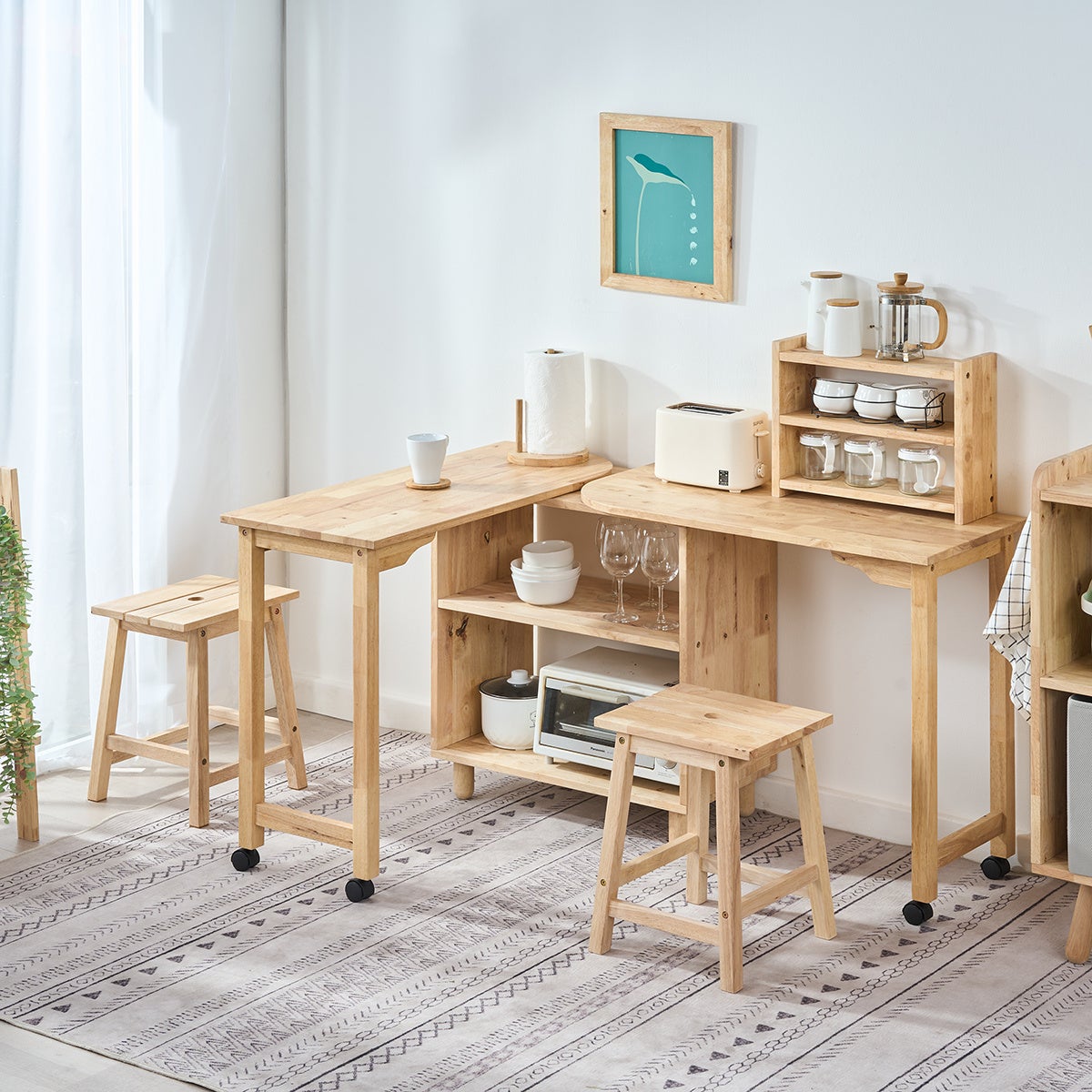 天然木ダイニング3点セット、天然木キャスター付きサイドテーブルなど、色や素材が統一されているので部屋のコーディネートがしやすいです。お求めやすい価格となっていますので揃えやすいことも特徴です。