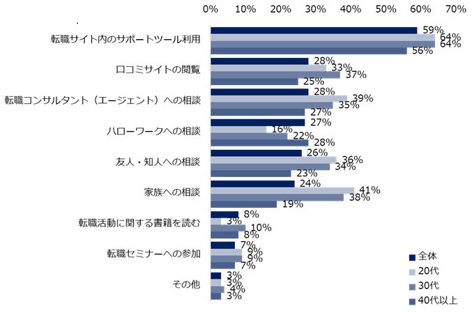 転職活動に不安を感じている方に、不安を解消するために実施したことを伺いました。上位は「転職サイト内のサポートツール利用」(59%)、「口コミサイトの閲覧」、「転職コンサルタント(エージェント)への相談」(同率28%)でした。年代別で見ると、20代・30代の第2位は「家族への相談」(20代:41%、30代:38%)でしたが、40代以上は19%と大きく差が開く結果になりました。