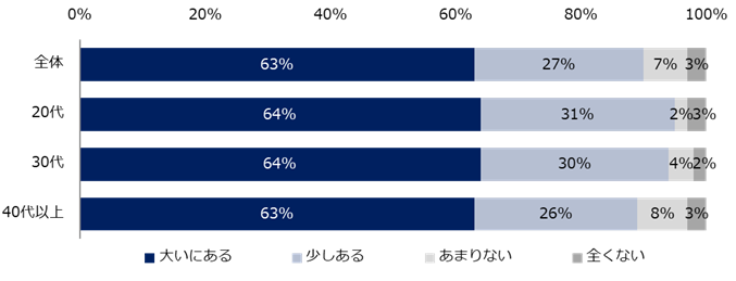 転職活動をする上で不安があるかを伺うと、63%が「大いにある」、27%が「少しある」と回答。計90%が不安を抱えていることが分かりました。年代別では、20代が計95%(大いにある:64%、少しある:31%)と最多になりましたが、30代は94%(大いにある:64%、少しある:30%)、40代以上は89%(大いにある:63%、少しある:26%)と大きな差は見られませんでした。