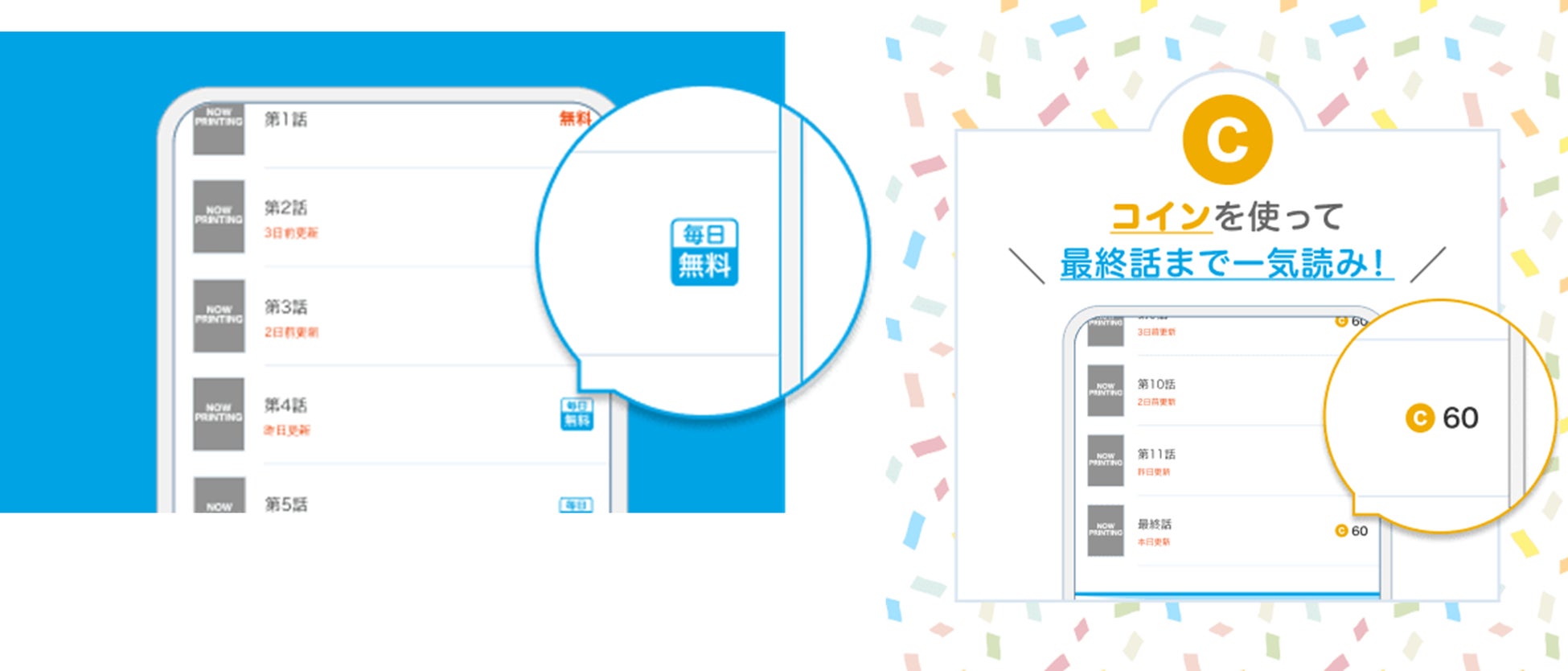 「毎日無料」とは対象作品1話が23時間のチャージ完了毎に無料で読めるサービスです。