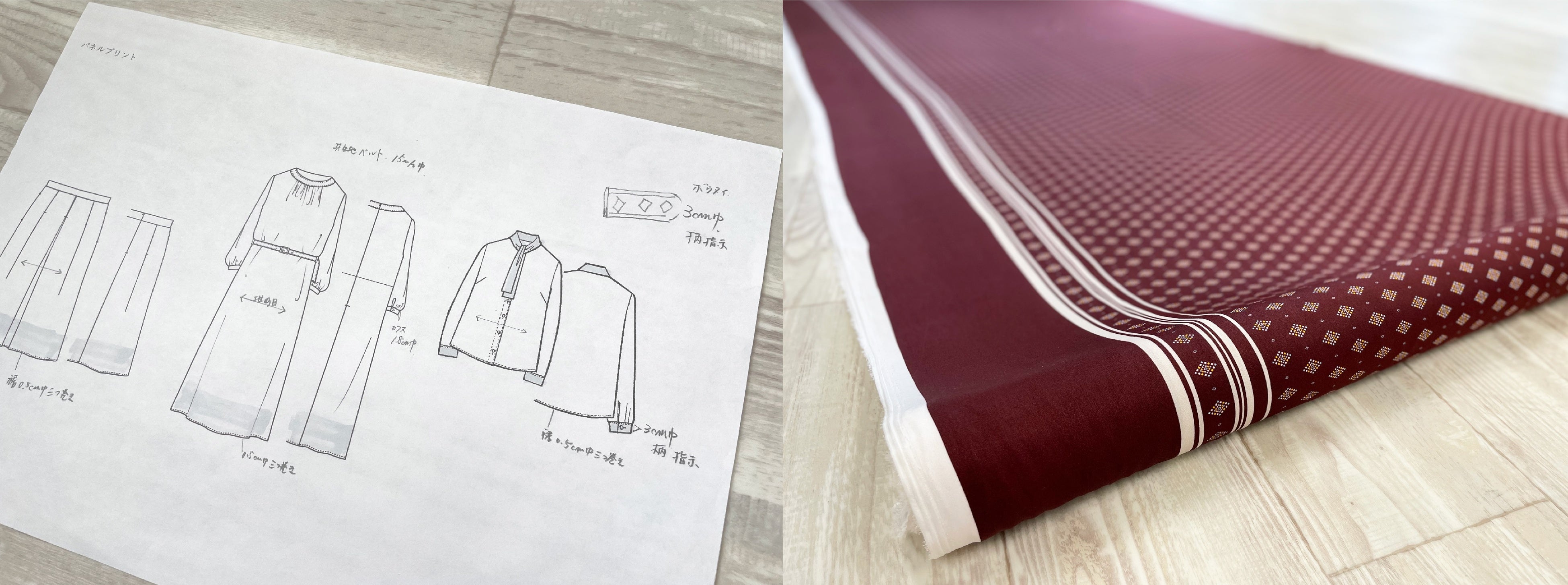 カレイドスコープのキラキラ輝く様子を、カラフルなクリスタルから成るダイヤ柄で表現。ネイビーベースには、ホワイト、オレンジ、パープルの3色。ボルドーベースには、ホワイト、イエロー、サックスの3色を組み合わせ、秋冬らしいクラシカルな印象を持たせました。ここに額縁のようなライン柄を配していきます。ミリ単位で幅調整を行い、品の良さを際立てるプリント柄が完成しました。