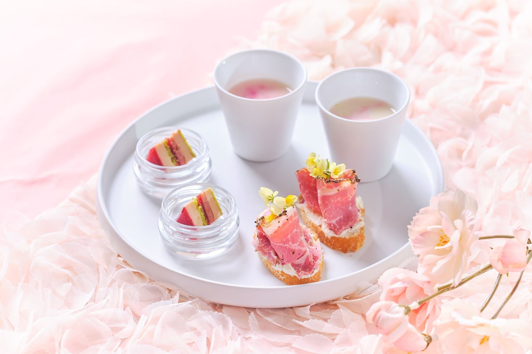 シャンパンといちごが好相性のグラスデザートや、いちごのクリームがぎっしり詰まった可愛いらしいフォルムの赤いクッキーシュー、さっぱりとしたグレープフルーツジュレを忍ばせたいちごのムース、ピスタチオクリームを詰めて焼き上げたいちごのタルト、サクサクのパイ生地に濃厚なカスタードクリームをサンドしたナポレオンパイなどいちご尽くしのスイーツ5種を提供。セイボリーは、フォアグラムースとピスタチオを使用した贅沢ミルフィーユや、黒胡椒を効かせたポークパストラミとラズベリー風味のクリームチーズのブルスケッタ、素材の味を活かした蕪のクリームスープの3種をお楽しみいただけます。