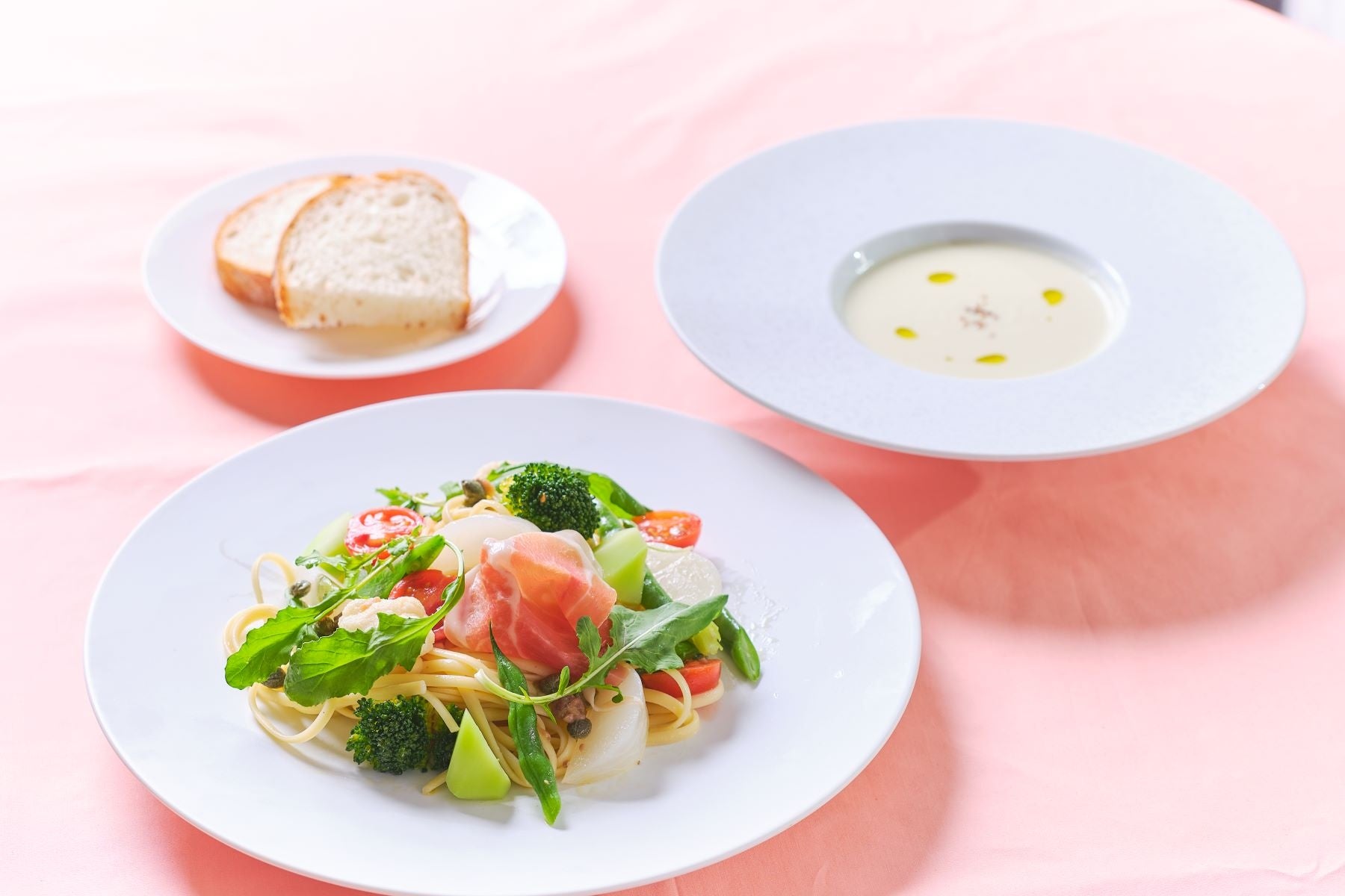 キャベツとベーコンのクリームスープ 黒胡椒の香り/春野菜のアーリオ・オーリオ 生ハム添え