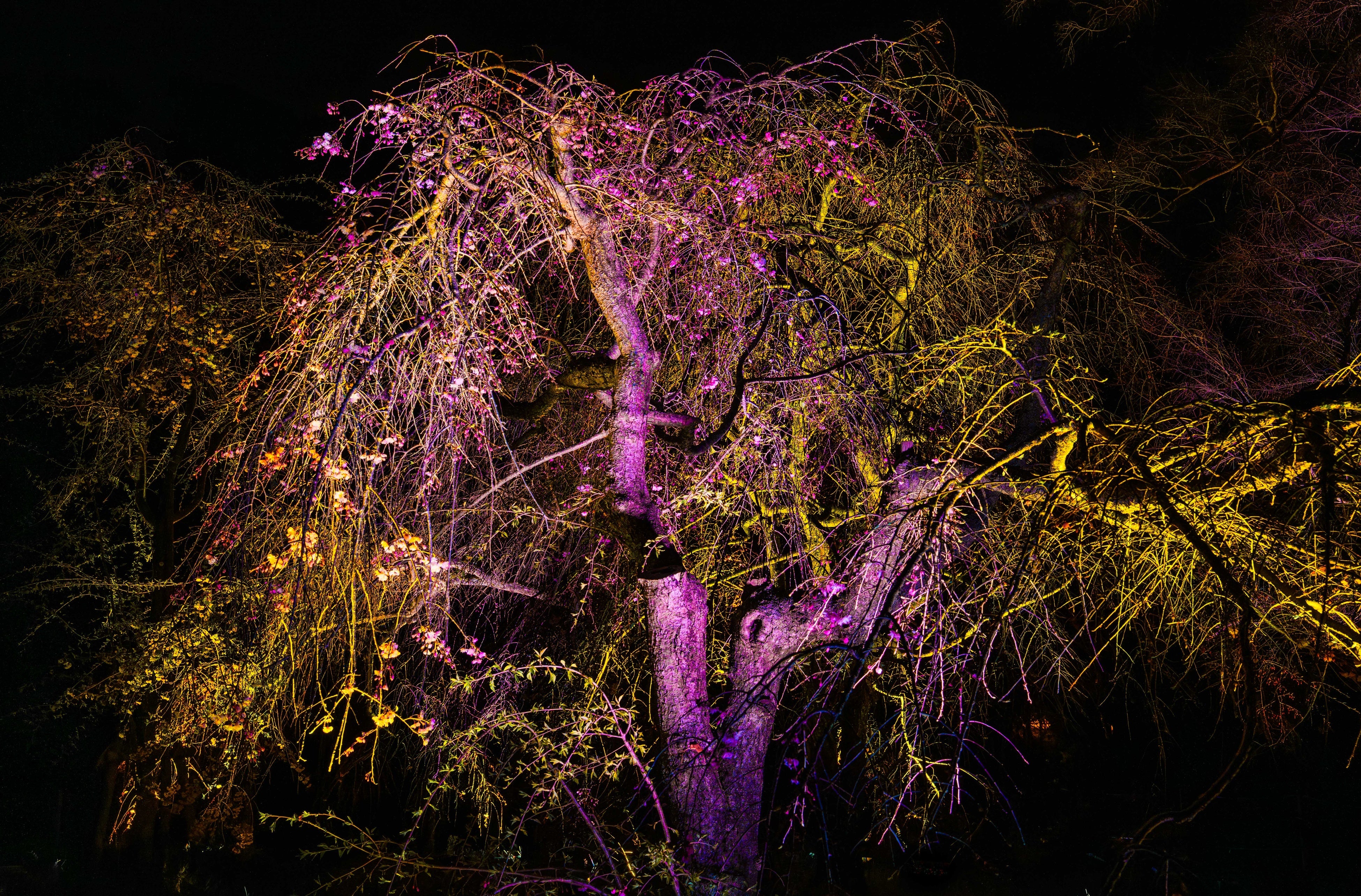しだれ桜の開花期間、桜に合わせた色で輝く《呼応する木々 - しだれ桜》を『チームラボ ボタニカルガーデン 大阪』で4月4日(土)から公開