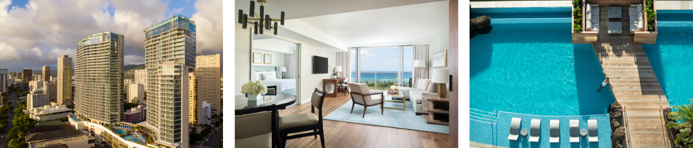 2016年7月の開業から本年で6周年を迎えた当リゾートは、今年8月には同じくアメリカの旅行雑誌、「トラベル+レジャー」誌が毎年発表している「ワールド・ベスト・アワード」内、「ハワイ州内最優秀リゾート」リストにおいても、オアフ島内の高級リゾートとして最高位に選出されております。旅行雑誌による読者投票結果のみならず、これまでも数々の賞を受賞している当リゾートは、2棟のタワーに552室のスタイリッシュな客室とスイートルームを擁し、ハワイの地元らしさを取り入れた、5つ星リゾートならではのアメニティとサービスをご提供しております。全ての客室とスイートからは、雄大な太平洋の景観をお楽しみいただけ、床から天井までの連なる大きな窓とラナイが、ワイキキでの最高に贅沢な時間を演出いたします。館内には、プライベートカバナ付きの2つのインフィニティプール、有名人トレーナーのハーレー・パスナーク氏が設計したフィットネスセンター、オアフ島の自然の要素と伝統的な癒しの方法をトリートメントに取り入れたスパなど、充実の施設をご用意しております。 また、ハワイ地元の味わいを楽しめる料飲施設に加え、モダンなフランス料理レストラン「La Vie」や、有名寿司職人、中沢啓治氏が手がける16席のおまかせスタイルの寿司レストラン「すし匠」など、国際的なグルメ体験をご提供するレストランも取り揃えております。
