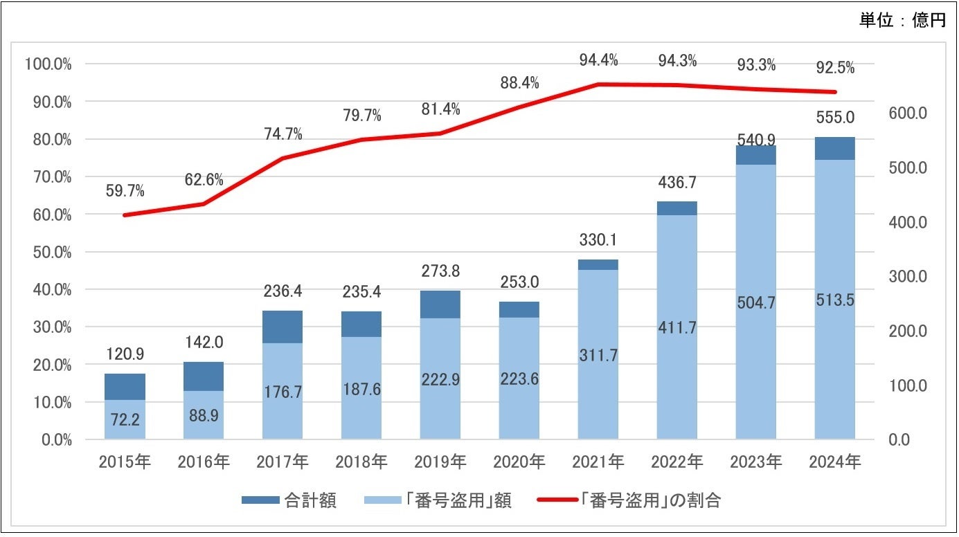 クレジットカード不正利用被害額は2024年で555億円と過去最高額を記録し、そのうち約92.5%を番号盗用による不正利用が占めています(※1)。背景には、実在のサービスや企業を騙って偽のメールやSMS(携帯電話のショートメッセージ)で偽サイトに誘導し、クレジットカード番号やパスワードなどの情報を盗み取る「フィッシング」の増加があります。