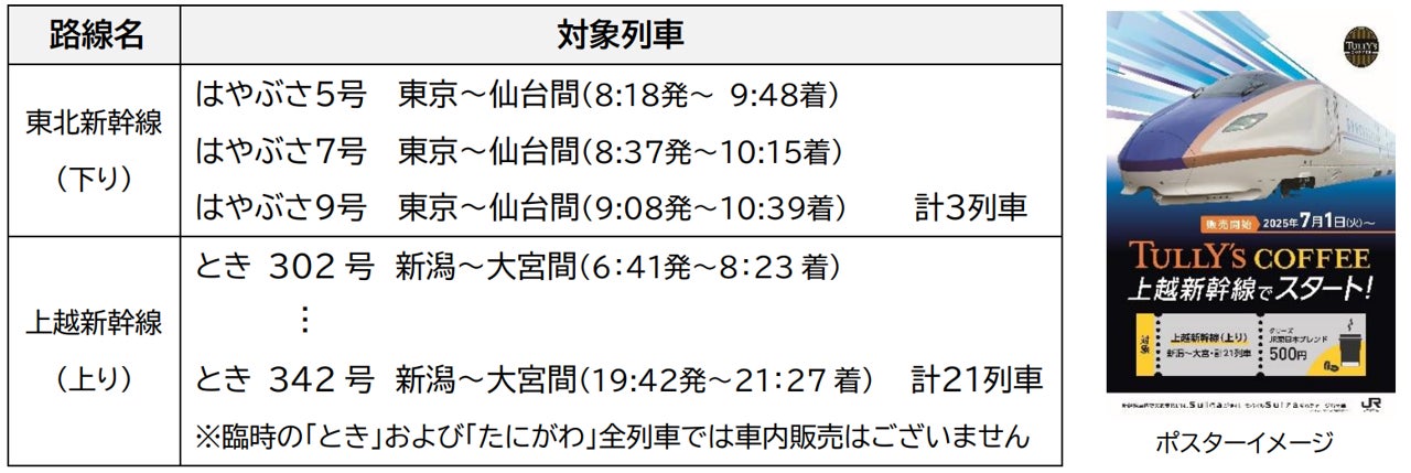 〇新幹線での移動空間をより快適、豊かなものにするため、伊藤園グループと連携し、現在東北新幹線の一部列車・区間の車内において販売している「タリーズスペシャルティコーヒー」をグレードアップし、2025年7月1日より新たに「タリーズJR東日本新幹線ブレンド」として、東北新幹線の対象列車に加え、上越新幹線とき号でも販売を開始します。