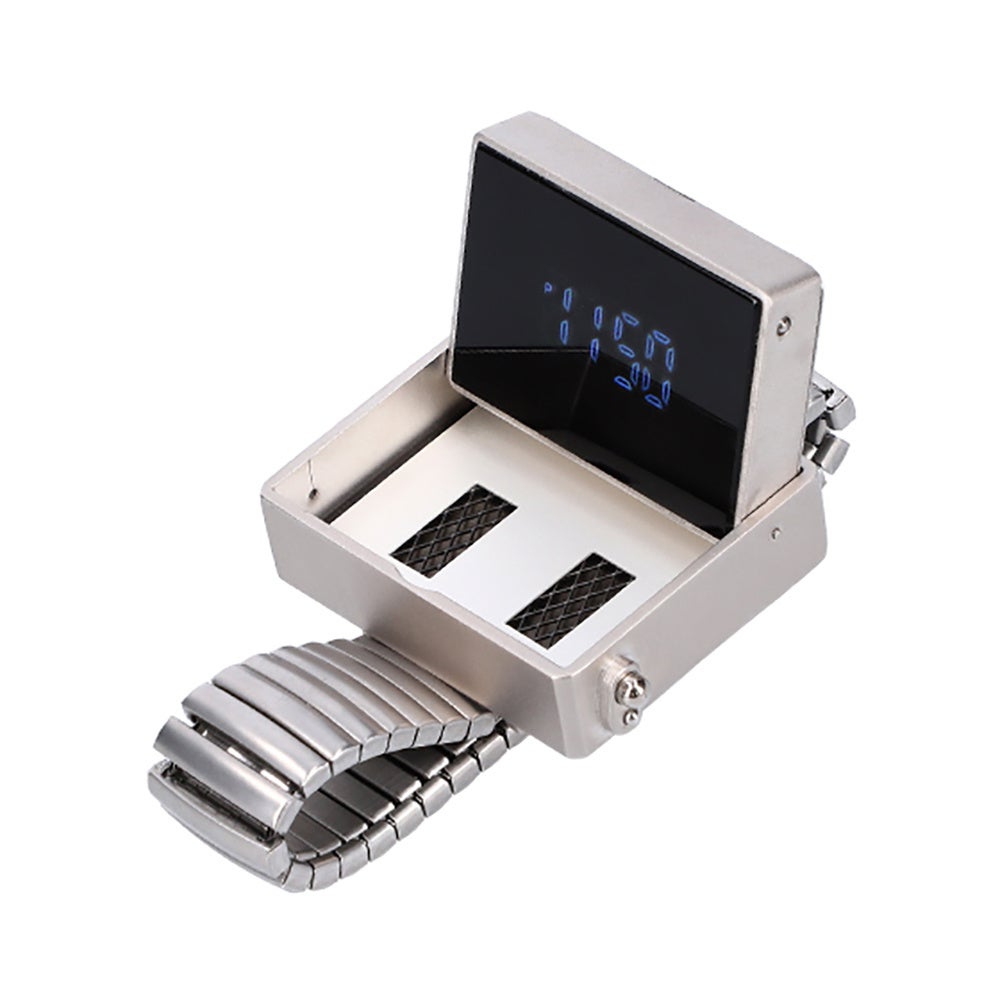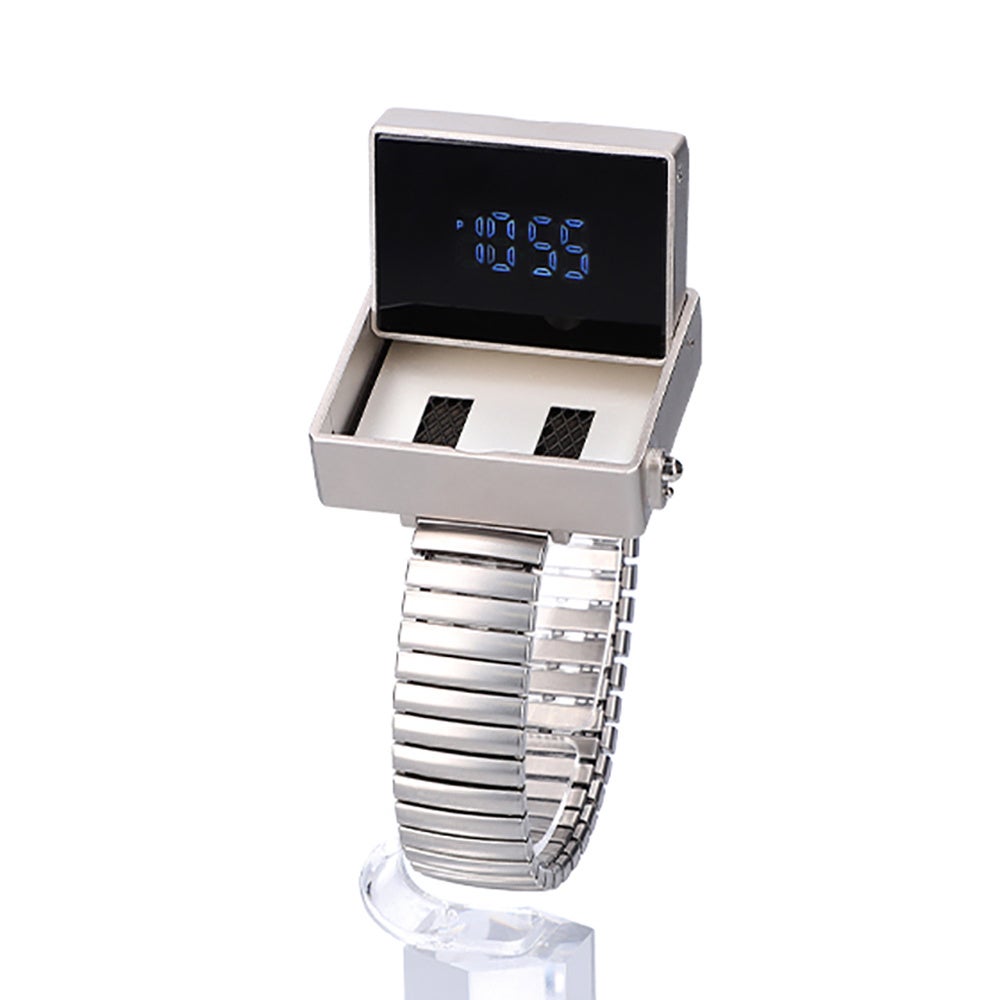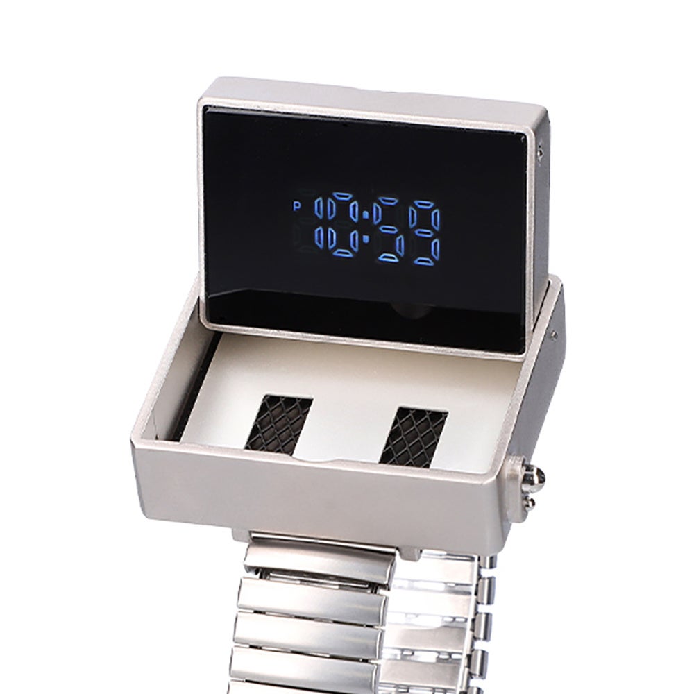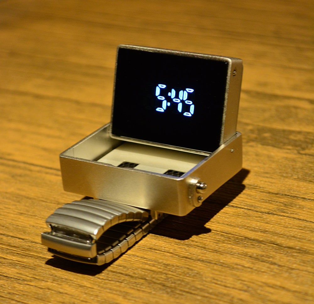 原寸大のサイズ感で、外観の美しさを保つため操作ボタンは全てなくし、時刻表示面にフレームの端ギリギリまでガラスパネルをはめ込むことでフォルムを忠実に再現。「あの憧れの機器を腕に装着して使える」という夢を追い求め、実現することに注力しました。白色7セグメントLEDの独特の揺らぎと共に映し出される時刻は柔らかく時を伝えてくれます。