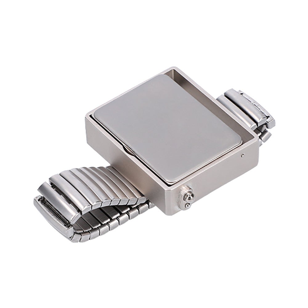サンドブラスト加工で仕上げた天面は、見た目からリアルさを徹底追求。原寸大のサイズ感を忠実に再現し、必要な機能すべてをサイズ内に収めるために、多数のモジュール・加工方法を検討し、削ぎ落とすデザインを重ねています。ベルト部分はステンレスの蛇腹ベルトを採用しています。