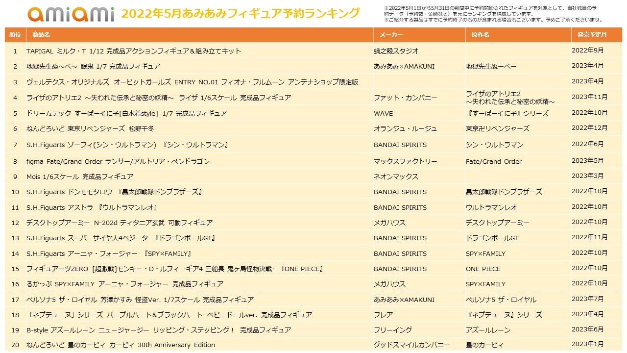「アズレン」「東方Project」「ウマ娘」「ホロライブ」など人気タイトルの美少女キャラクターはもちろん、人気アニメ「SPY×FAMILY」のキャラクターもランキングに初登場です。『2022年5月あみあみフィギュア予約ランキング』にご注目ください。