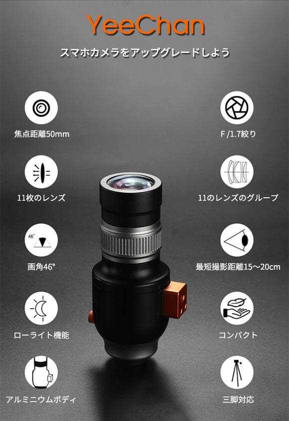 そんな一番身近なカメラをパワーアップするために、「YeeChan」はスマートフォン専用に設計された被写界深度(DOF)をコントロールできるレンズを作成しました。50mm/F1.7により、鮮やかな高画質で被写体を捉えることができ、浅い被写界深度を活かした大きなボケの表現や低照度下での手ブレを抑えた撮影が可能です。デザインや操作感もフィルムカメラに近く、スマホでの写真撮影をよりプロフェッショナルに楽しんでいただけます。