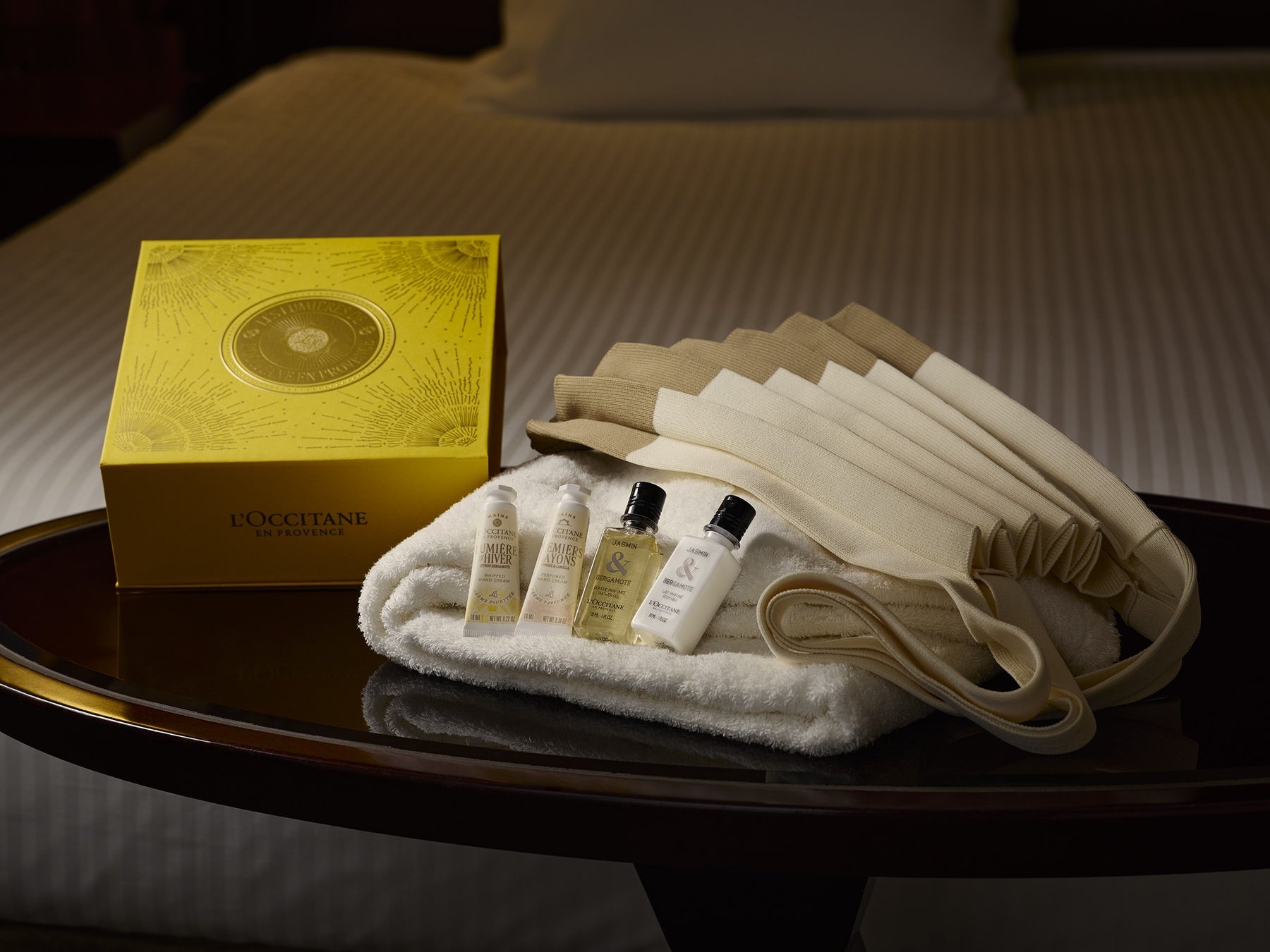アメニティは、繊細で清らかなピオニーとカメリアが朝露と溶け合うみずみずしく華やかな香りの「プルミエール レイヨン」と、太陽の光をまとった柑橘とクラリセージが織りなす爽やかさとぬくもりが調和した香りの「ルミエール ディヴェール」のハンドクリーム、さらに「ジャスミン&ベルガモット」の香りが広がるシャワージェルとボディミルクをご用意。プリーツバッグを含むアメニティ5点をギフトボックスに詰めてチェックイン時に、お一人様1セットお渡しいたします。香りと潤いに包まれる上質な癒しのステイをぜひこの機会にお楽しみください。