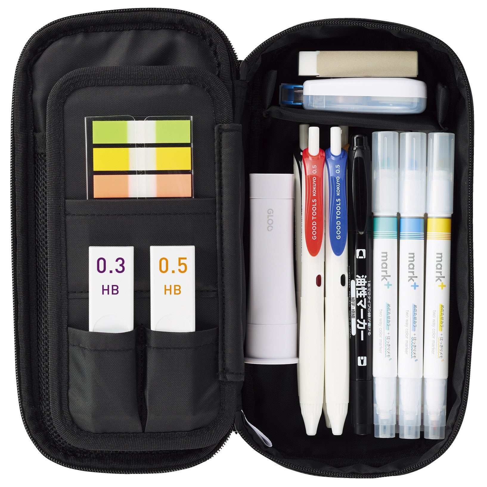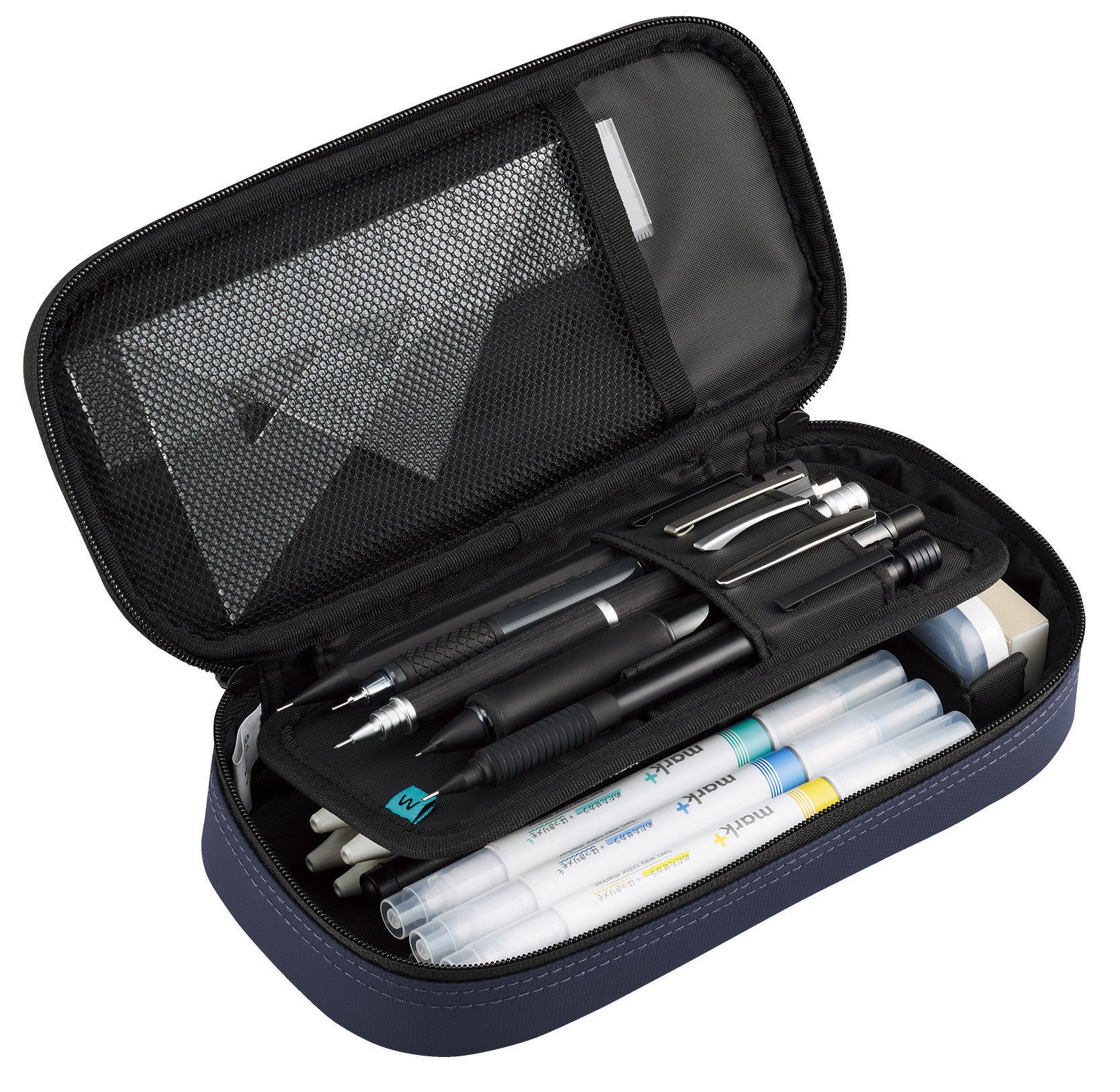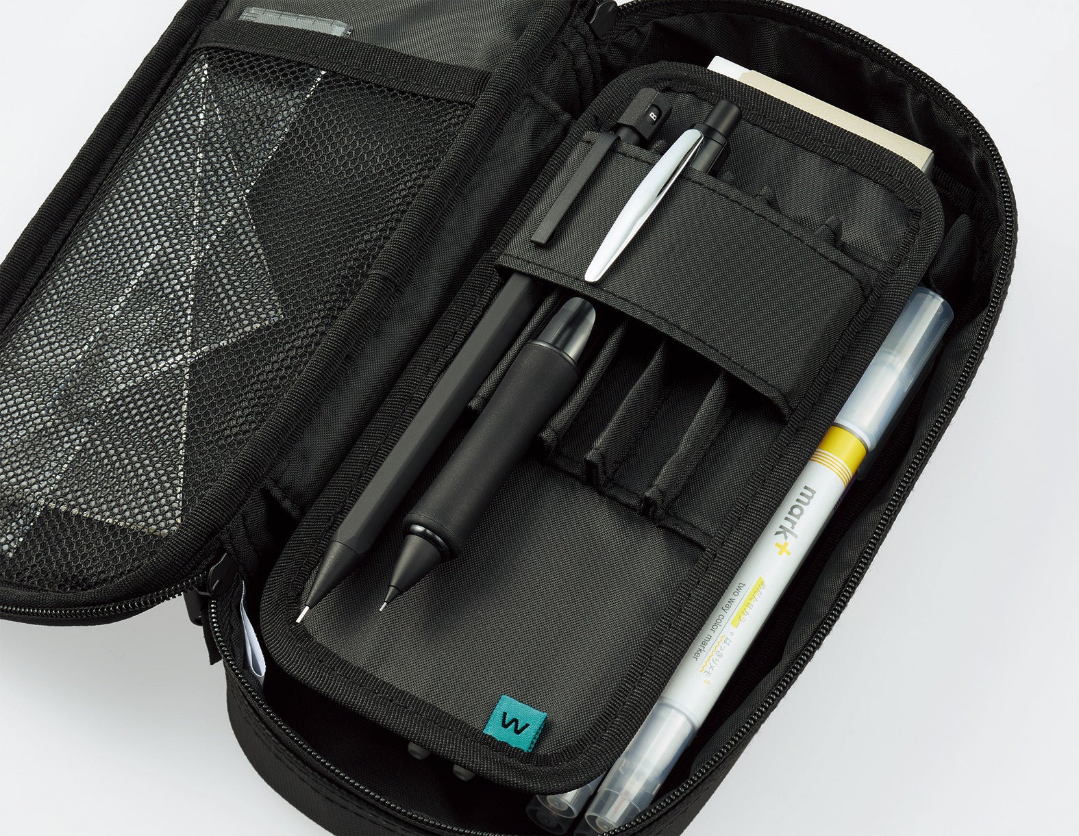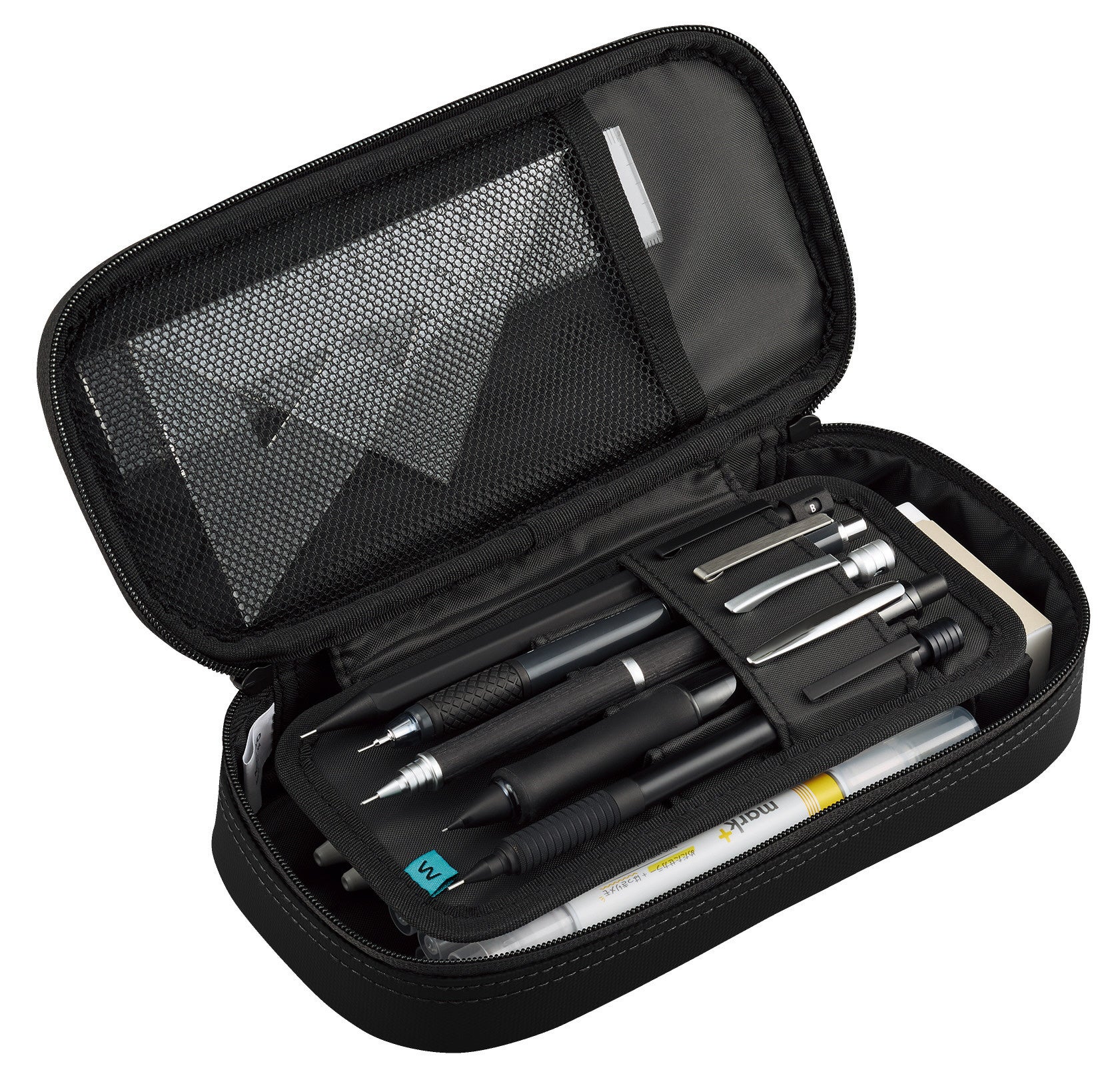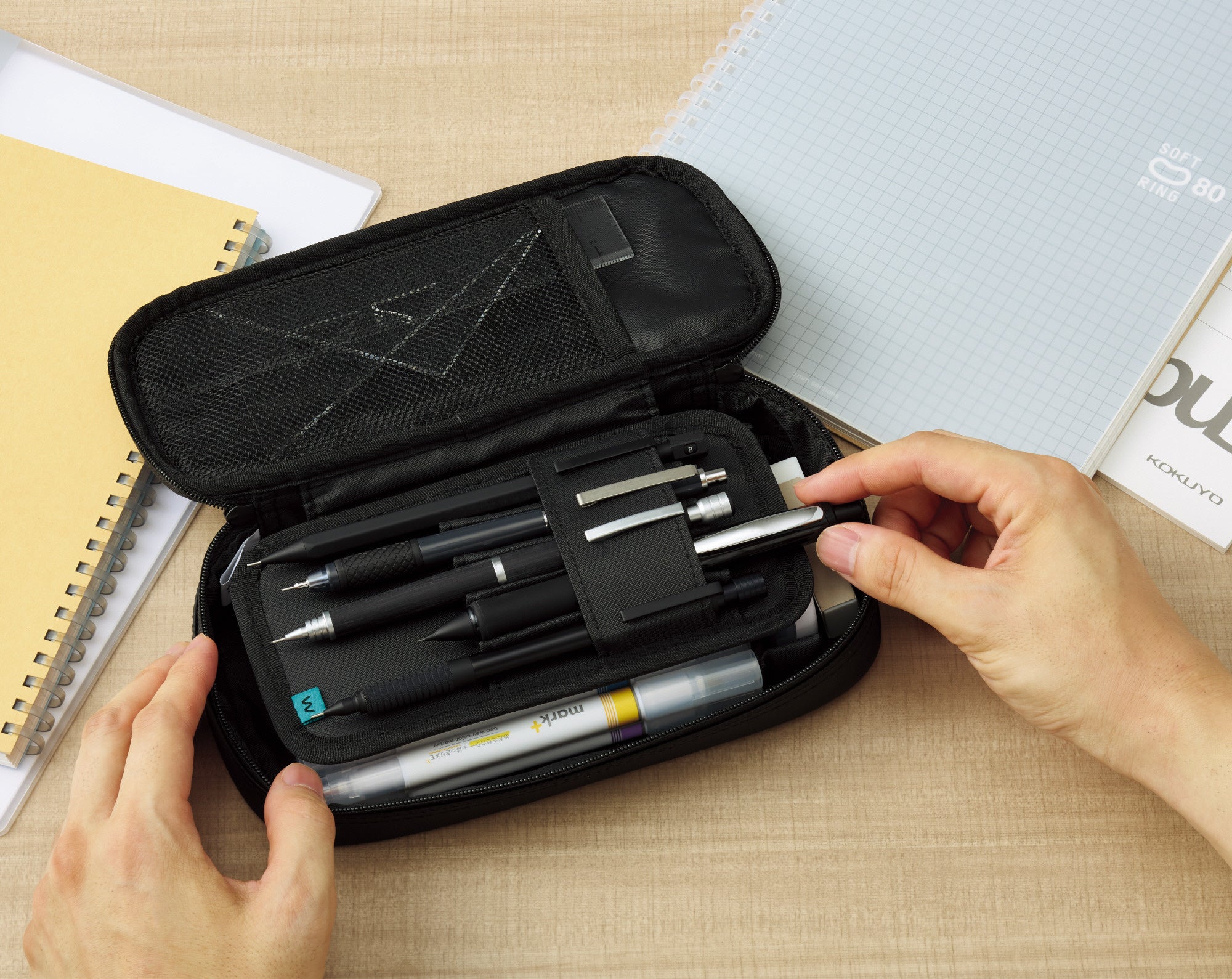 上段には“波なみホルダー”で固定したお気に入りの筆記具をきれいに並べられ、下段には他の筆記具や消しゴムなどの小物を分けて収容できる広いスペースを備えています。さらに、ふせんやシャープペンシルの替芯を収められる小物ポケットや、中身を確認しやすいメッシュポケットを設けており、文具をすっきり整理できます。お気に入りの筆記具とサブの文具を分けて収容できるため、整理のしやすさと高い収容力を両立しています。上段には5本、下段には約15本の筆記具を収容できます。