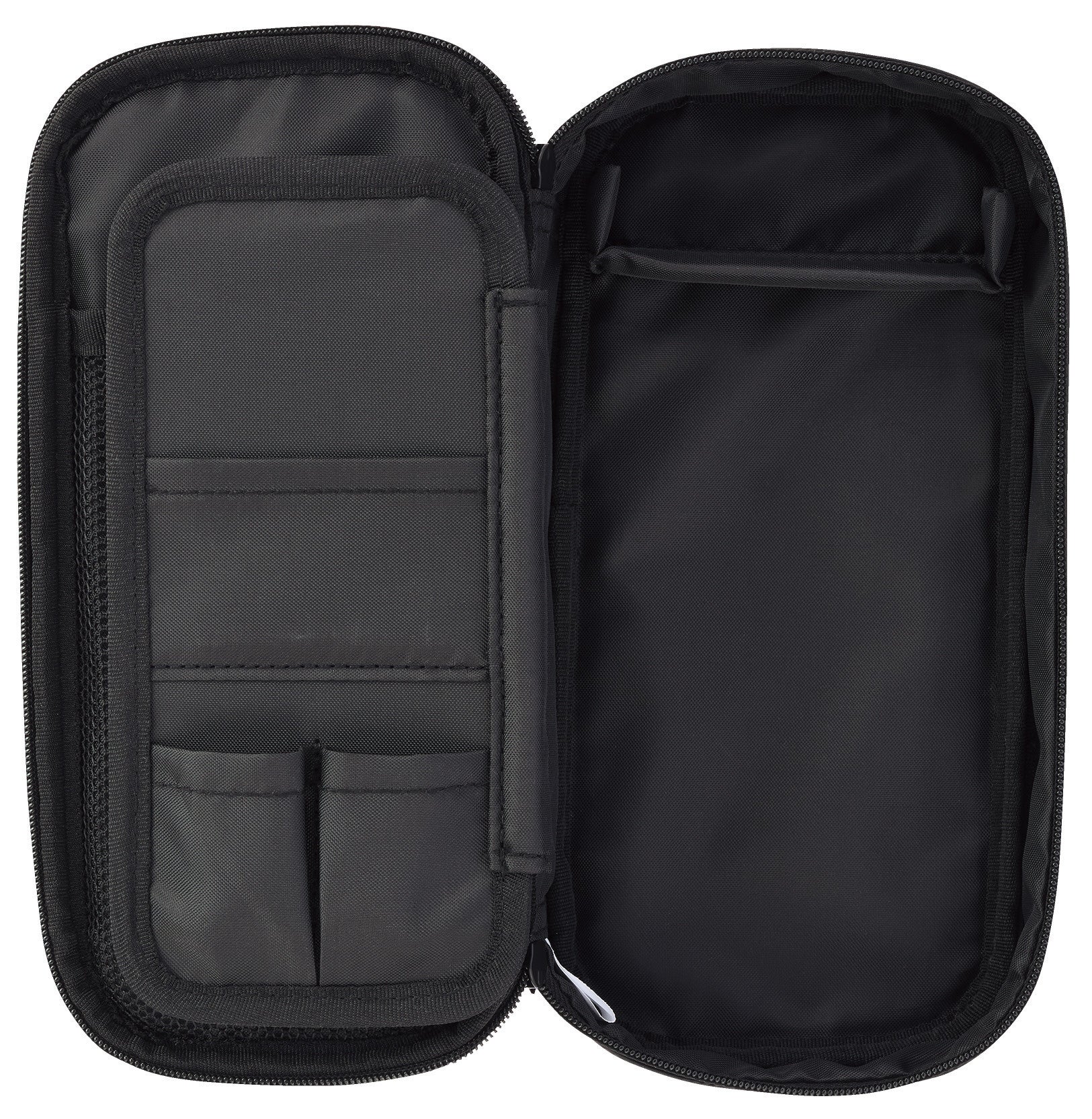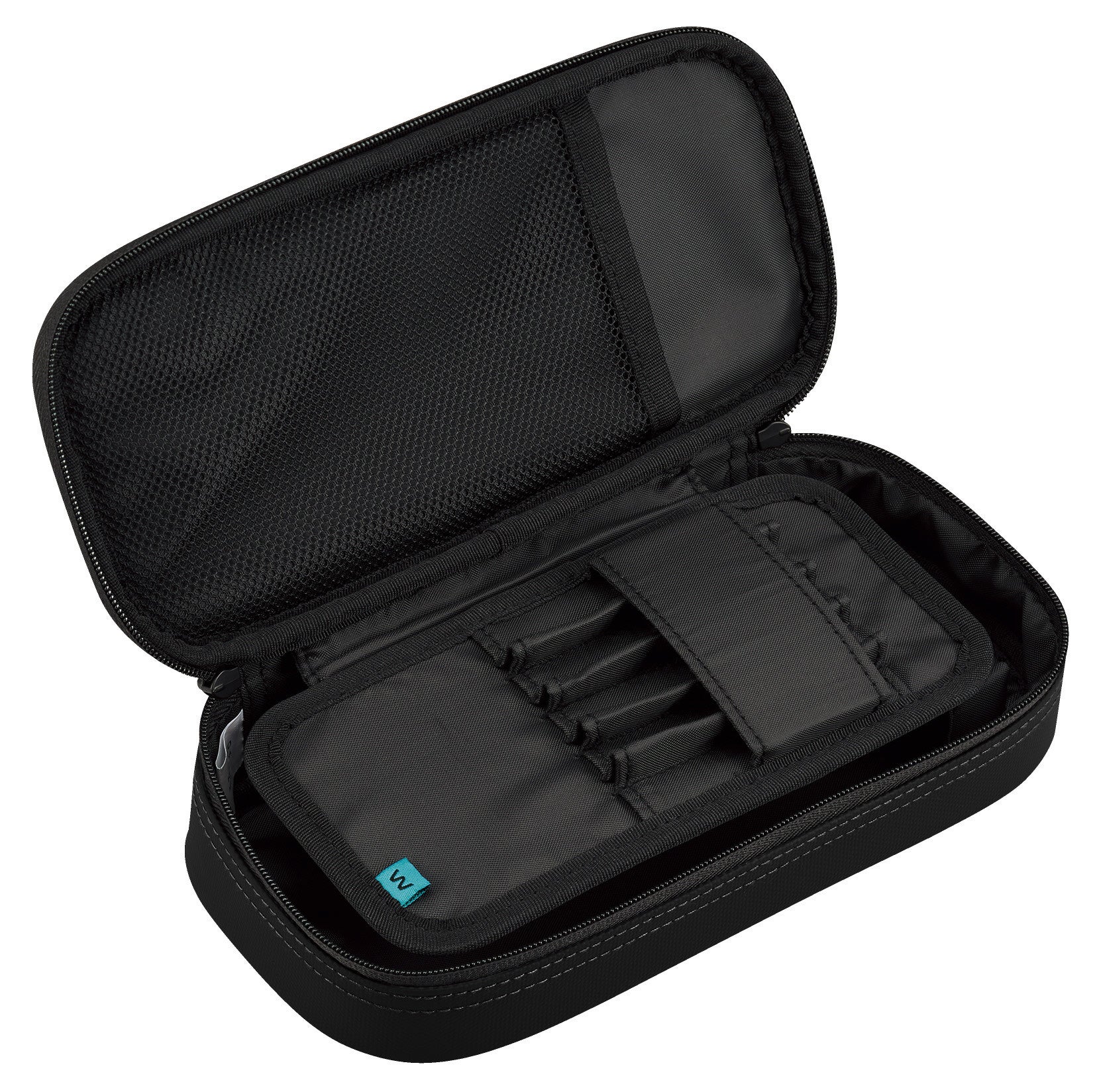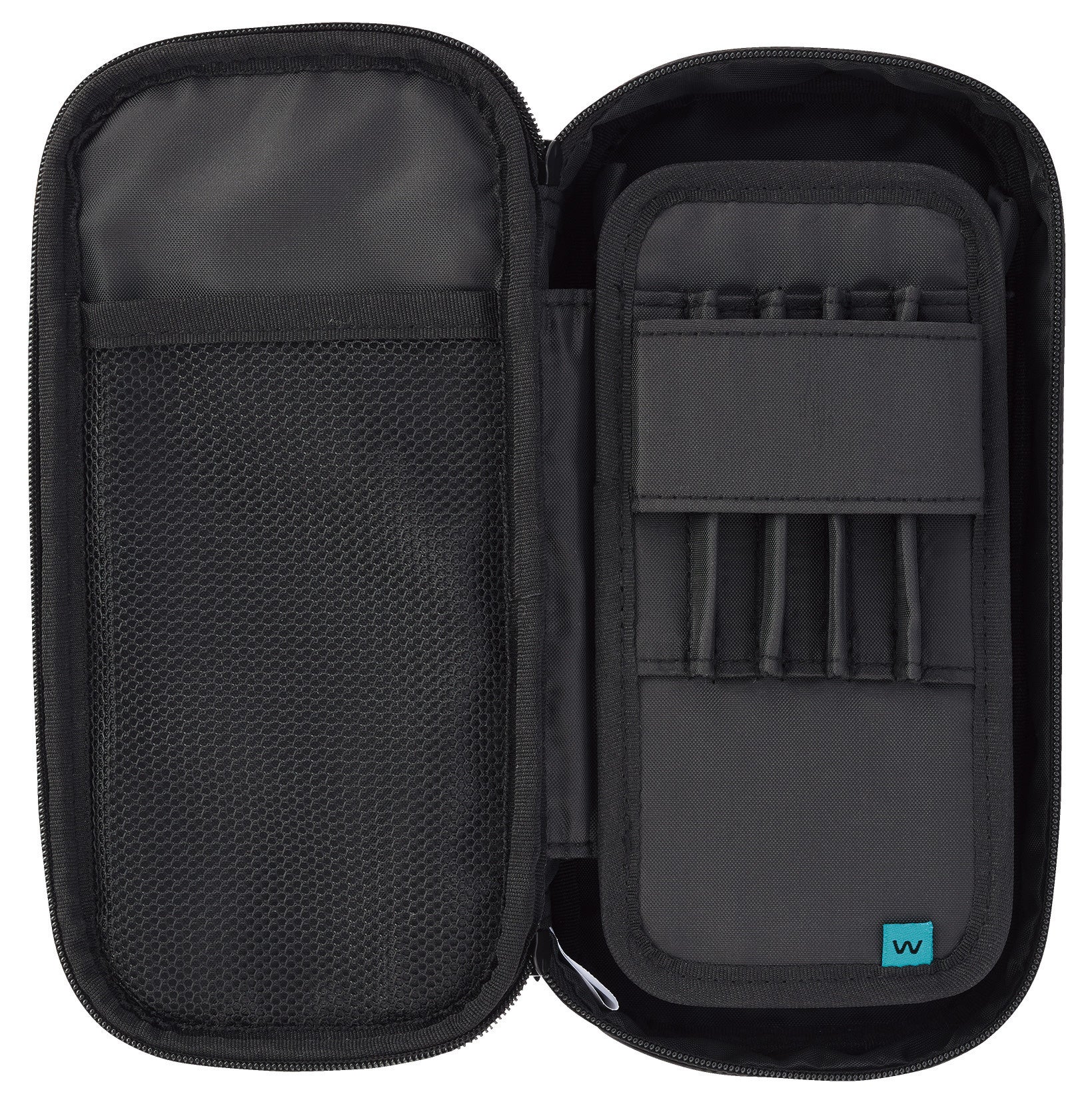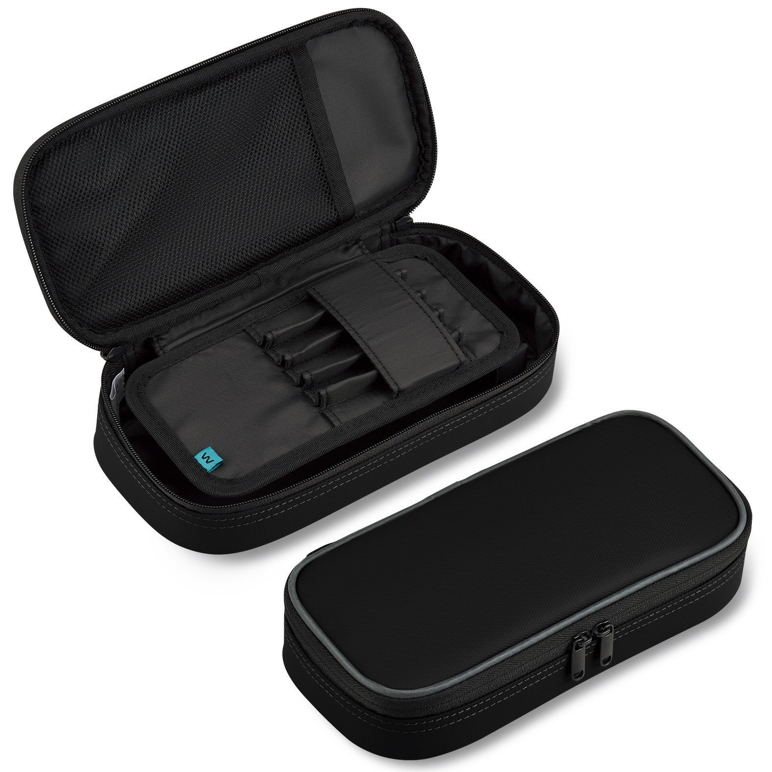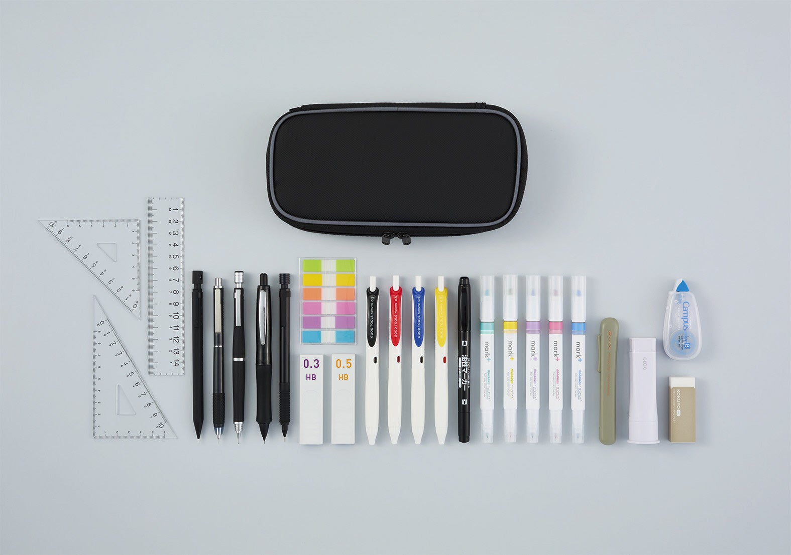 上段には“波なみホルダー”で固定したお気に入りの筆記具をきれいに並べられ、下段には他の筆記具や消しゴムなどの小物を分けて収容できる広いスペースを備えています。さらに、ふせんやシャープペンシルの替芯を収められる小物ポケットや、中身を確認しやすいメッシュポケットを設けており、文具をすっきり整理できます。お気に入りの筆記具とサブの文具を分けて収容できるため、整理のしやすさと高い収容力を両立しています。上段には5本、下段には約15本の筆記具を収容できます。