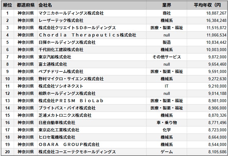 株式会社SalesNow(本社:東京都渋谷区、代表取締役:村岡功規、以下「当社」)は、国内540万社の企業情報を完全網羅した日本最大級のデータベース「SalesNow DB」より、上場企業を対象に神奈川県に本社を置く企業の平均年収データを集計・分析し、「平均年収ランキング」として公開いたしました。