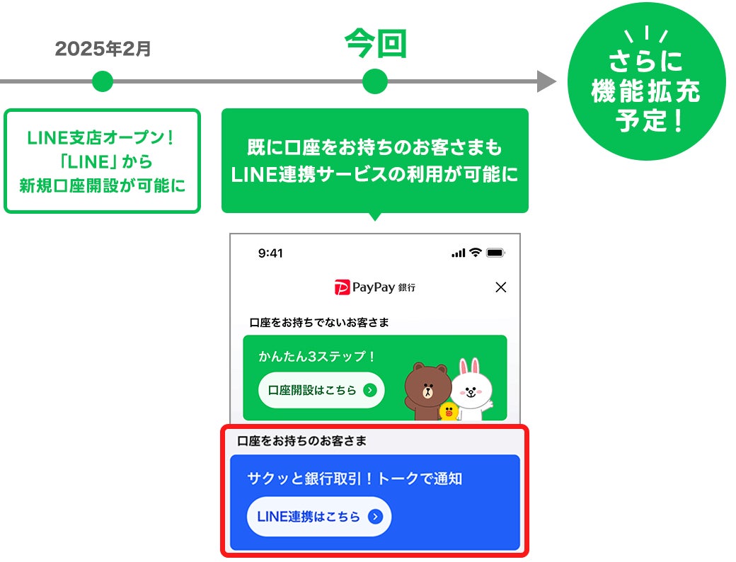 PayPay銀行株式会社(東京都新宿区、代表取締役社長:田鎖 智人、以下、PayPay銀行)とLINEヤフー株式会社(東京都千代田区、代表取締役社長 CEO:出澤 剛、以下、LINEヤフー)は、LINEヤフーが提供するコミュニケーションアプリ「LINE」(以下、「LINE」)から1タップでPayPay銀行のサービスにアクセスできる 「LINE連携サービス」(以下、本サービス)を、PayPay銀行の口座をお持ちのすべての個人のお客さまに対して提供開始しました。本サービスの提供を開始した2025年2月には、「LINE」を経由して「LINE支店」の口座を新規開設したお客さまのみが本サービスを利用可能でしたが、このたび、その他の支店の口座を既にお持ちの個人のお客さまも本サービスの利用が可能になりました。