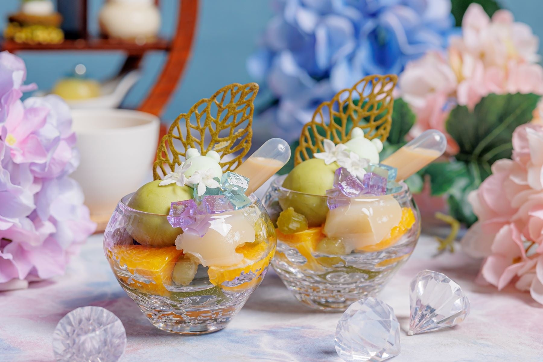 紫陽花の豊かな色彩が初夏の息吹を伝えるこの季節は、紫陽花がテーマの清涼感あふれるジューシーなメロンを使った数々のデザートや、紫陽花カラーの寒天とカエルメレンゲを飾り、黒蜜きなこのソースで味の変化も楽しめる夏みかんと抹茶を使用したさっぱりしたあんみつ付きの限定アフタヌーンティーで、華やかなティータイムをお届けします。