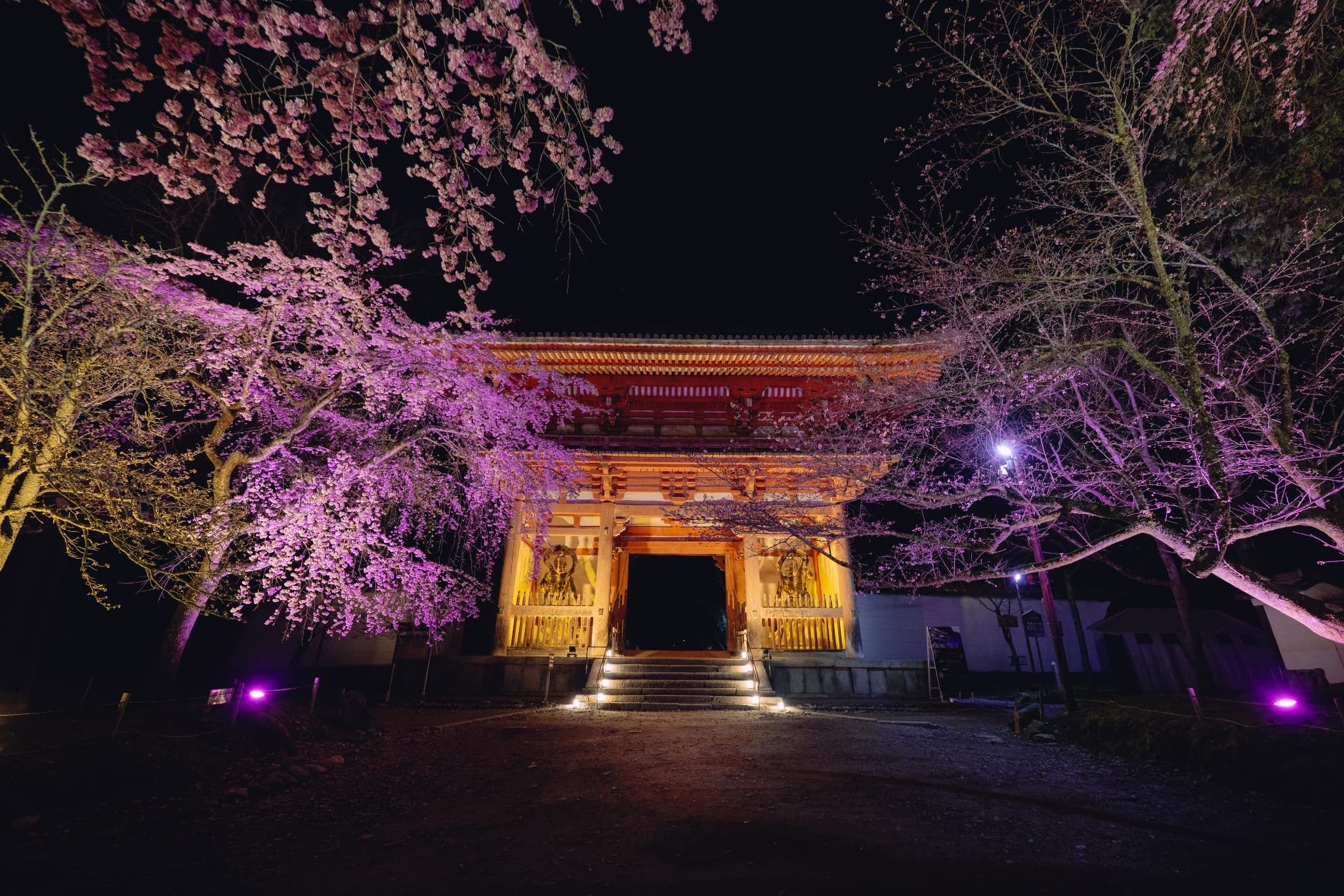 照らし出された仁王門と、静かに佇む金剛力士像。