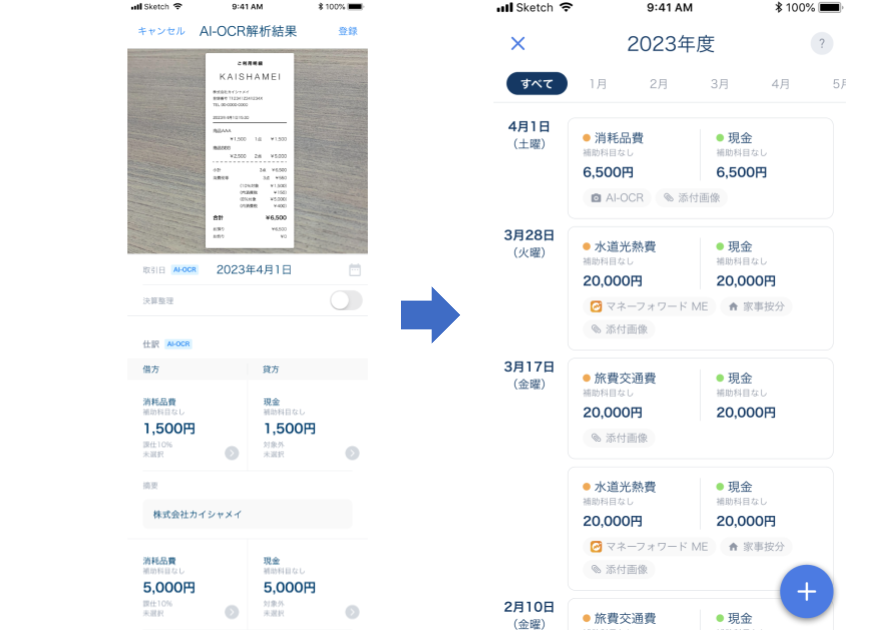 この度、『マネーフォワード クラウド確定申告』の「AI-OCR自動仕訳機能(アプリ版)」の提供により、領収書の取引内容を自動で読み取り、仕訳候補まで自動作成することで、確定申告の作業負担を削減できます。また、本機能は電子帳簿保存法のスキャナ保存にも対応しています。