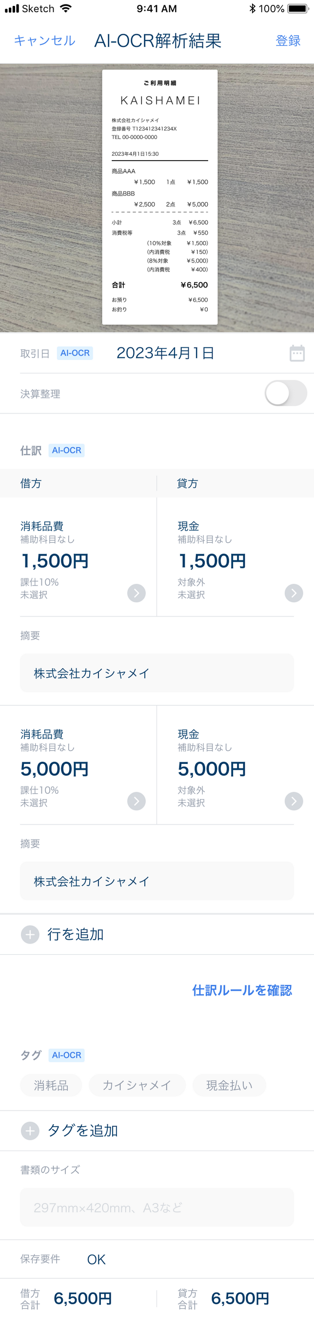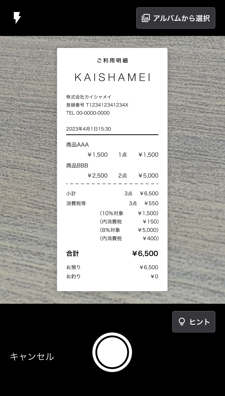 レシートや領収書をスマートフォンで撮影し、仕訳候補まで自動で作成