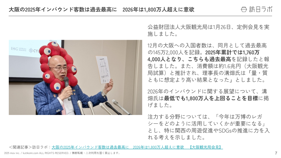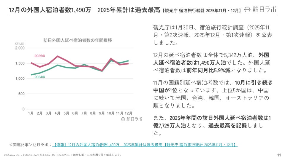 業界最大級のインバウンドビジネスメディア「訪日ラボ」及び 店舗向け集客一元化プラットフォーム「口コミコム」を運営する株式会社mov(代表取締役:渡邊 誠、本社:東京都渋谷区、以下mov)は、「インバウンドに関する最新トレンド・データ」「政府・自治体・企業などのインバウンド関連の取り組み」をはじめ、インバウンド対策に役立つニュースをまとめた「インバウンド情報まとめ【2026年2月前編】」を公開しました。