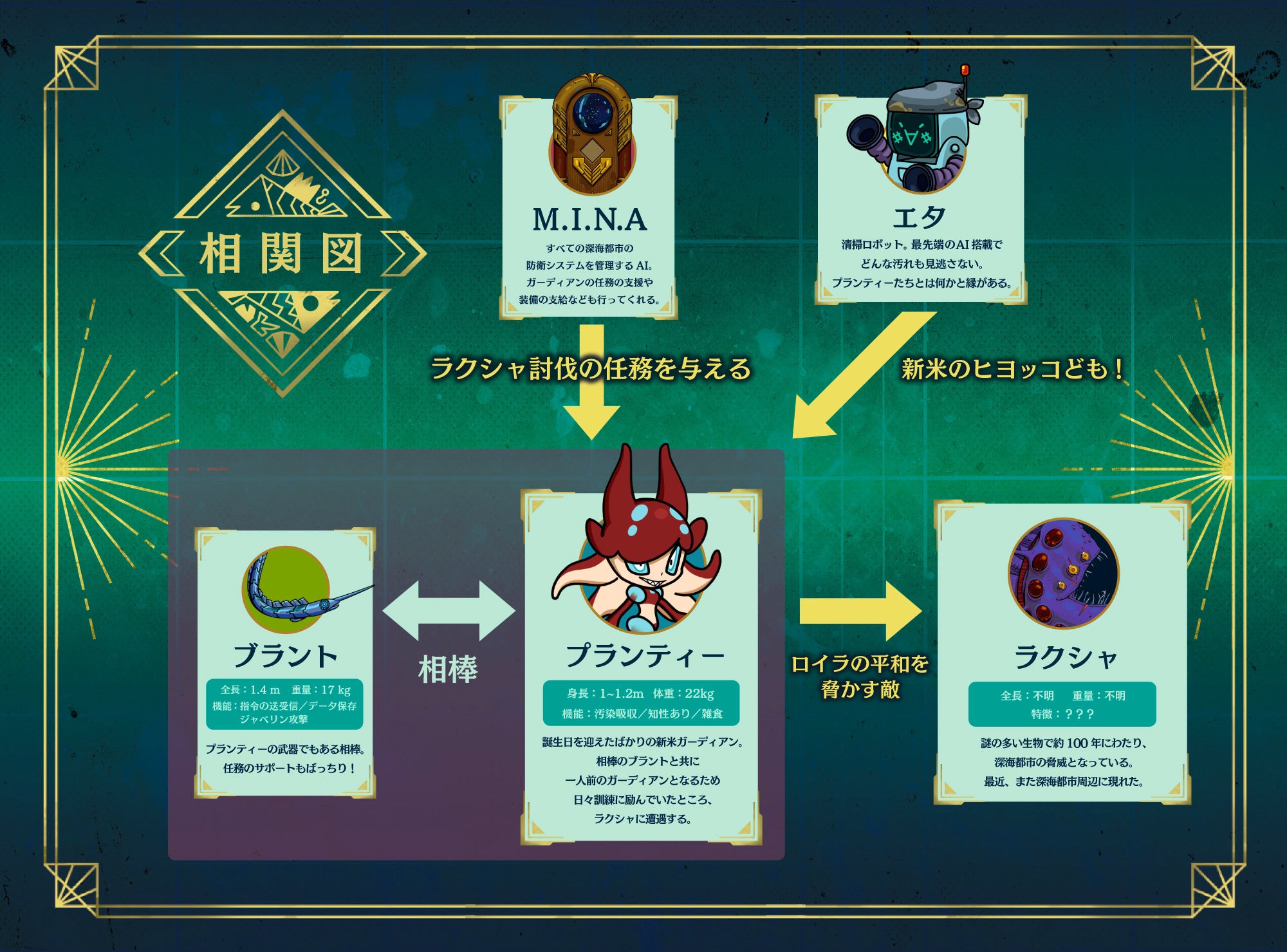 本作は、ガーディアン「プランティー」と相棒のメカジキロボット「ブラント」と共に、深海都市に侵入した変異モンスターと戦いながら、深海に隠された秘密を見つけ出すメトロイドヴァニア系の深海探索型アクションです。