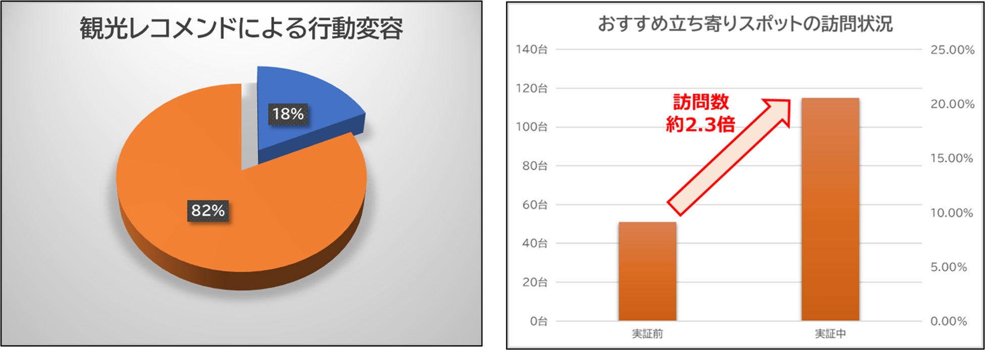 琉球大学 神谷准教授・東京大学大学院 福田教授によると、「これまでも様々な行動変容を促す取り組みをしているが、一般的には数パーセントの変容率。一概には言えないが、車中でのシンプルな提案(観光レコメンド)による18%の変容率はとても高い行動変化と言えるのではないか」との評価をいただいており、また実際にもおすすめの立ち寄りスポットへの訪問数は増加し、地域経済の活性化に寄与する形となりました。