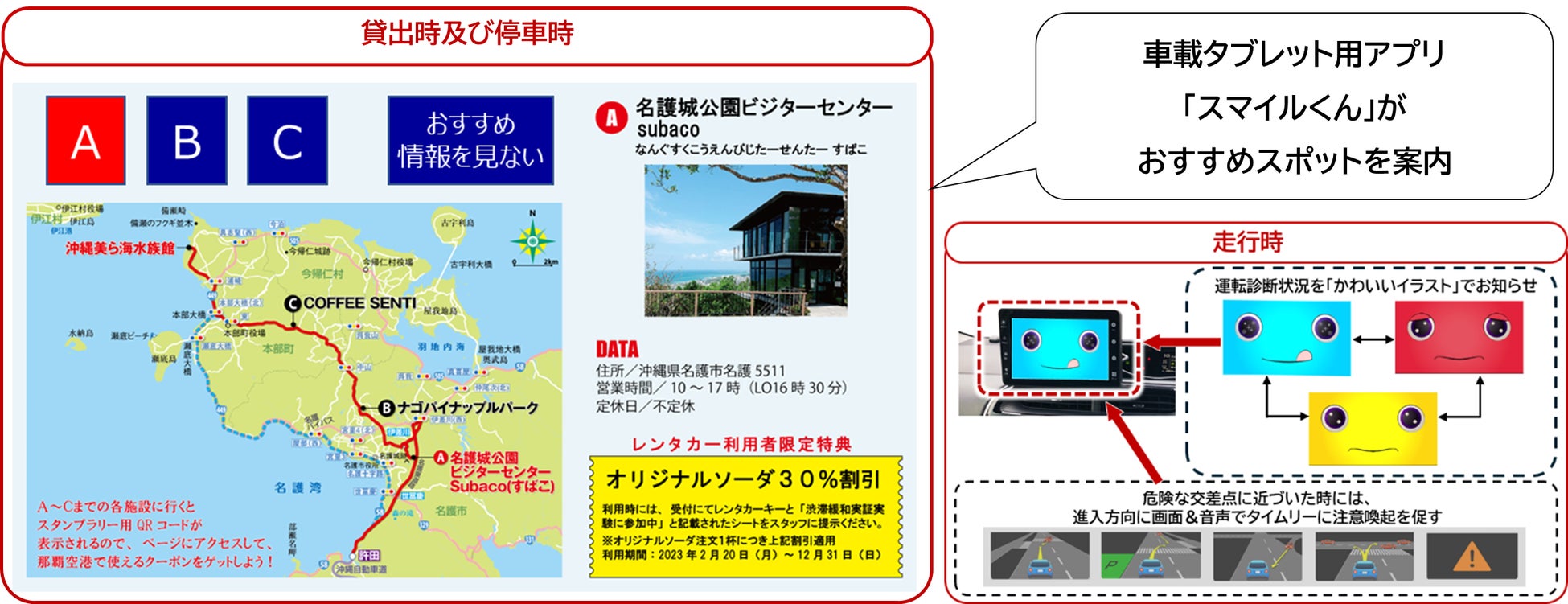 2021年12月から沖縄県において、一般財団法人トヨタ・モビリティ基金、矢崎総業株式会社、株式会社トヨタレンタリース沖縄とレンタカー利用者の安全運転支援のための実証実験(ステップ1)、2022年からはトヨタ自動車株式会社、琉球大学、東京大学大学院工学系研究科も加わり、レンタカー車中空間での車載タブレット用アプリによる観光レコメンドを行うことで事故につながる交通渋滞の緩和と、分散周遊による地域の活性化を目指す実証実験(ステップ2)を実施してきました。また沖縄県警察本部とも連携協定を締結し、レンタカーの事故削減、事故データ・車両データ・車載アプリのデータ等から多角的な分析を実施、地域の課題解決について議論をしてきました。
