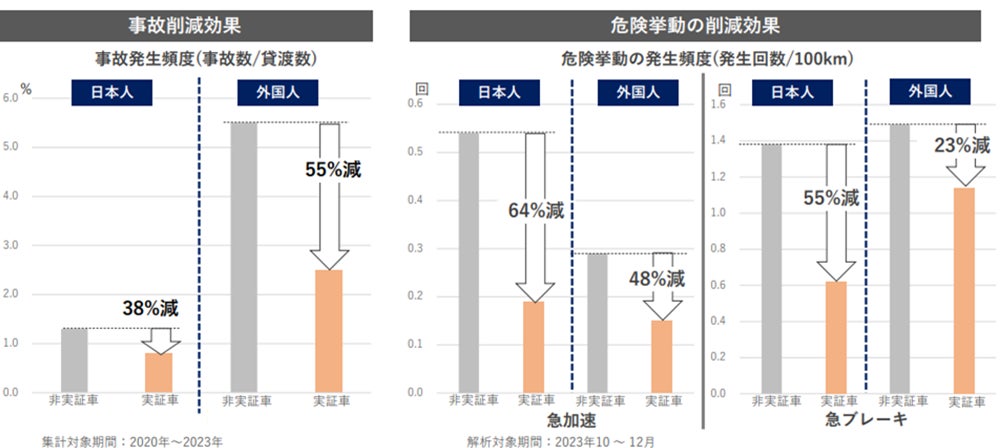 専用タブレット(矢崎総業製)を搭載した車両は、実証期間を通して事故の削減効果が認められ、外国人で55%、日本人で38%事故件数が減少しました。また、車両データの解析においても、急加速、急ブレーキともに改善がみられ事故件数の減少を裏付ける結果となりました。