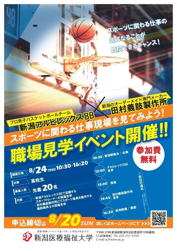 新潟医療福祉大学【スポーツに関わる仕事現場を見てみよう】バスケットボールチームやスポーツ装具の製作現場など、高校生を対象に職場見学イベントを開催!