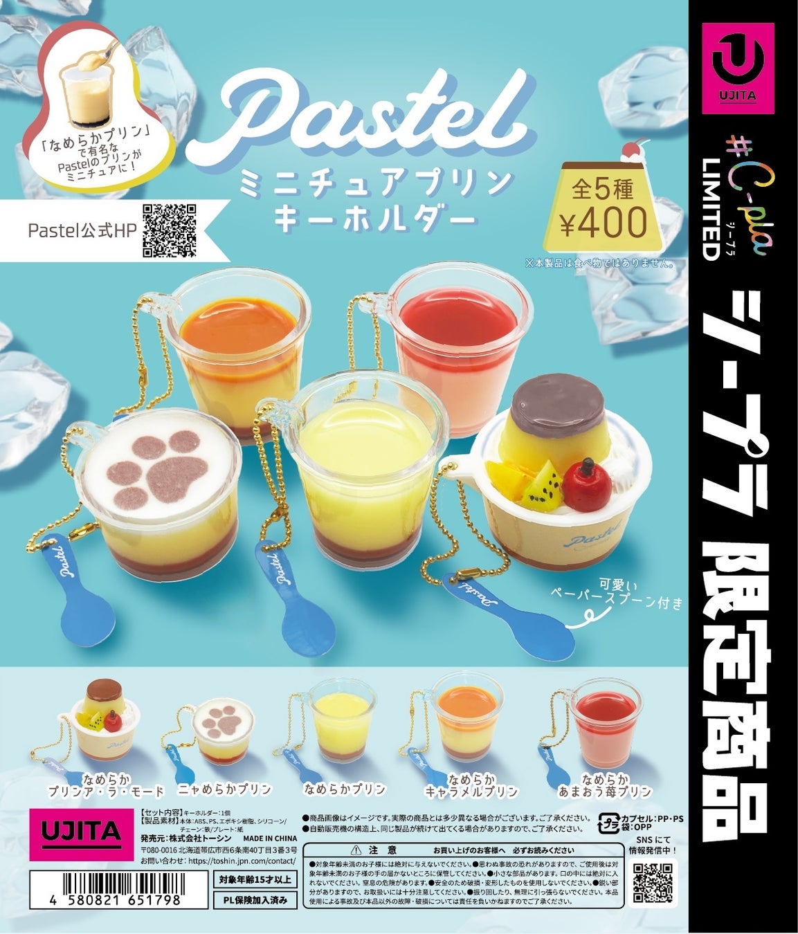 「パステル」は1984年に創業、看板商品の『なめらかプリン』は、“なめらかプリンブーム”の火付け役となり、現在も多くのお客様に親しまれています。そしてこのたび、人気スイーツ5種が全国のカプセルトイ専門店#C-pla限定でカプセルトイになって登場いたします。