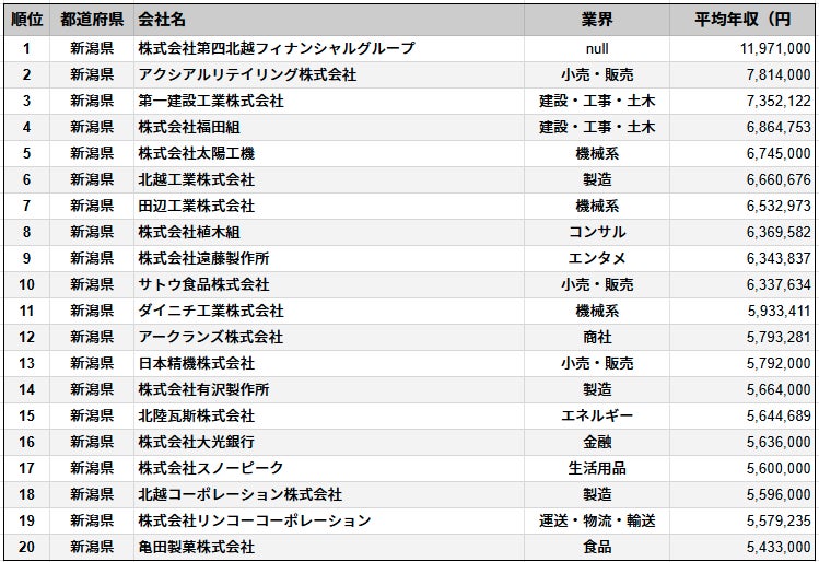 株式会社SalesNow(本社:東京都渋谷区、代表取締役:村岡功規、以下「当社」)は、国内540万社の企業情報を完全網羅した日本最大級のデータベース「SalesNow DB」より、上場企業を対象に新潟県に本社を置く企業の平均年収データを集計・分析し、「平均年収ランキング」として公開いたしました。