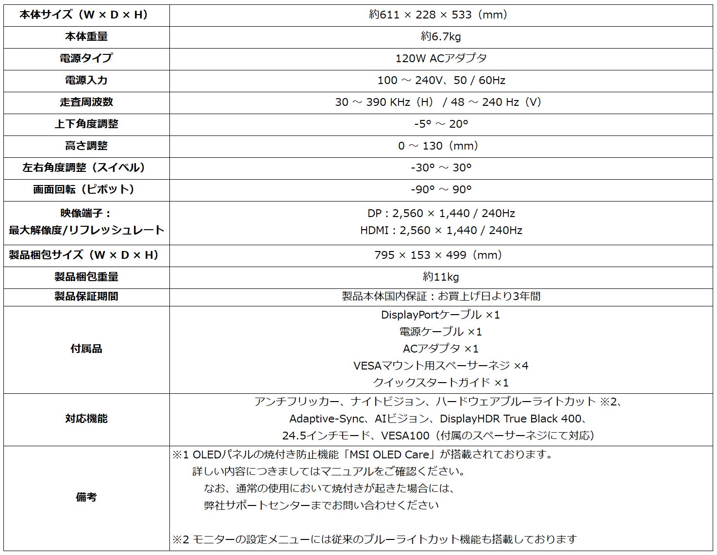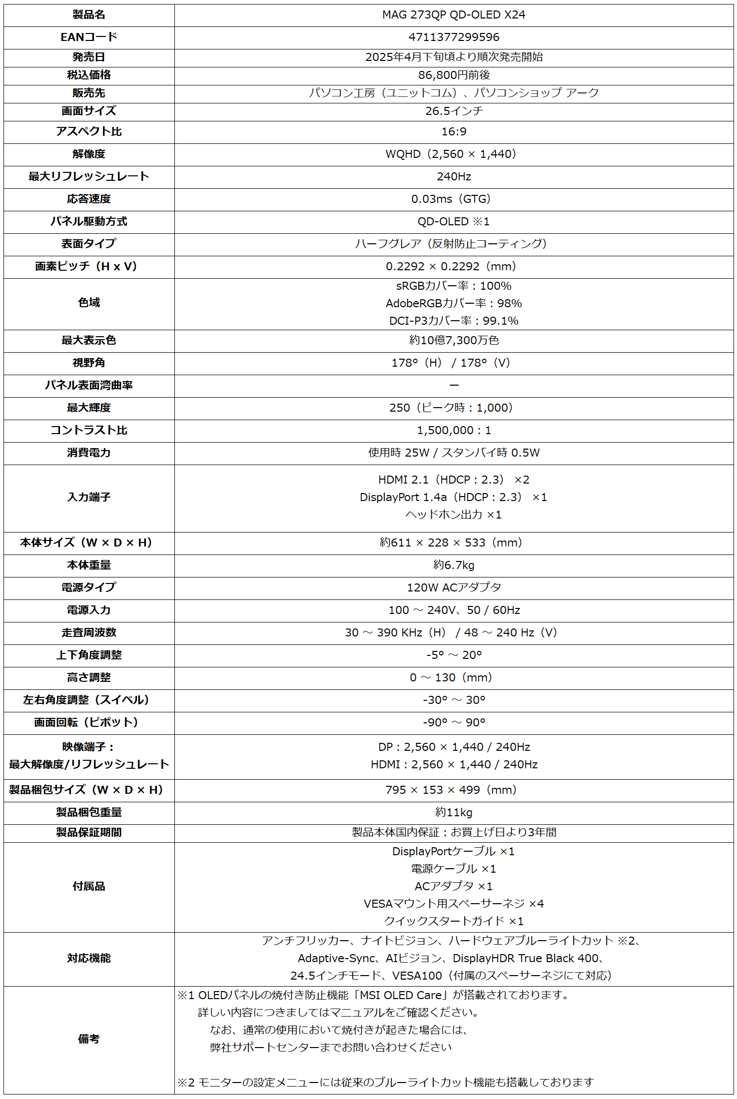 製品ページ: https://jp.msi.com/Monitor/MAG-273QP-QD-OLED-X24
