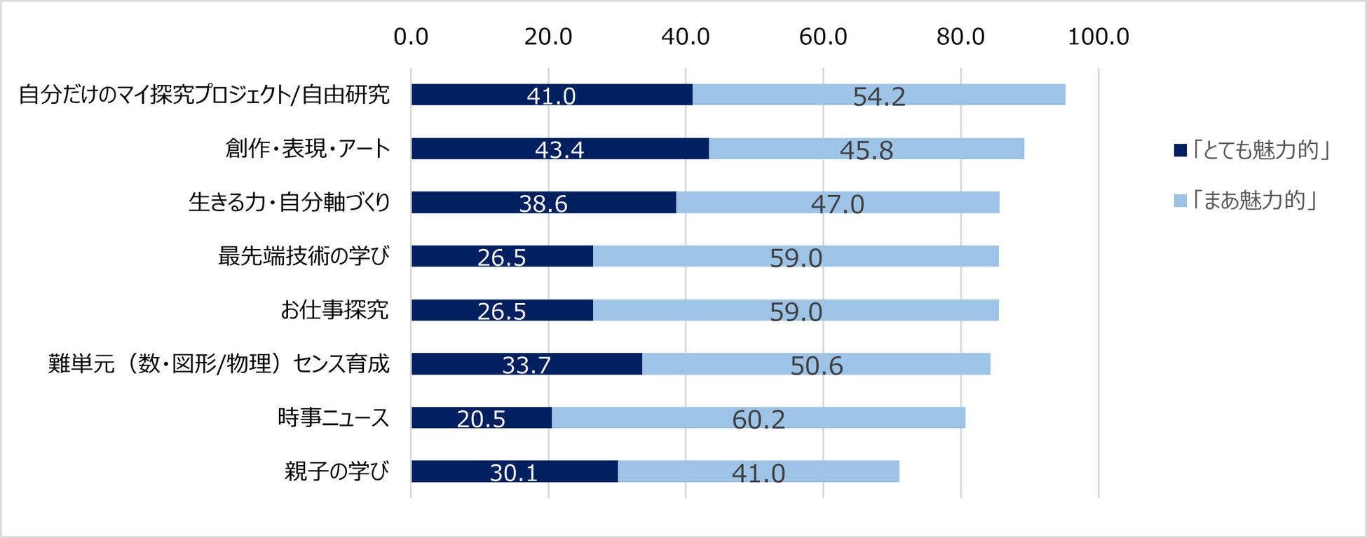 今回、「みらいキャンパス」が夏休みでの開講を検討した8テーマについて、「みらいキャンパス」に登録していた保護者に対してそれぞれの魅力度をアンケートしました(回答数:83名)。その結果、特に魅力を感じているテーマは1位「自分だけのマイ探究プロジェクト/自由研究」 となりました。「探究的な学び」は、令和4年度高校1年生からスタートした新教育課程で重視され、大学入試や大学での学びにも役立つと言われています。