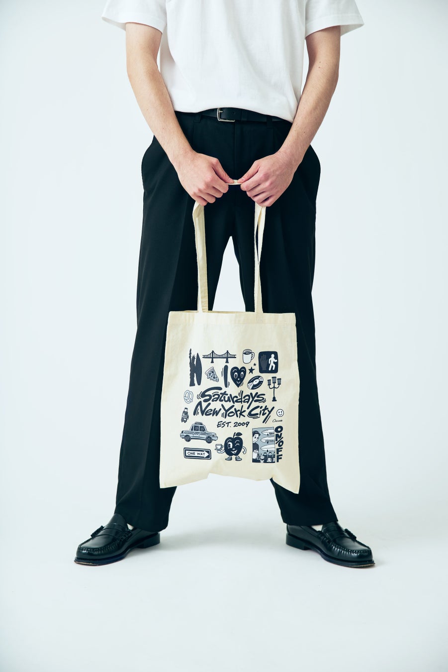 「Saturdays NYC」は、ブランド発祥の地である、ニューヨークの街並みやムードをテーマに依頼。ニューヨークの風景や訪れた際に目にするようなモチーフ、ブランドロゴなど、Chocomoo氏ならではのポップなタッチで描かれたアートワークをストレートに落とし込んだコレクションです。