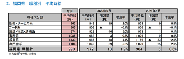 [福岡県版]2021年6月度 アルバイト・パート募集時平均時給調査 福岡県の6月度平均時給は前年同月より18円増加の990円