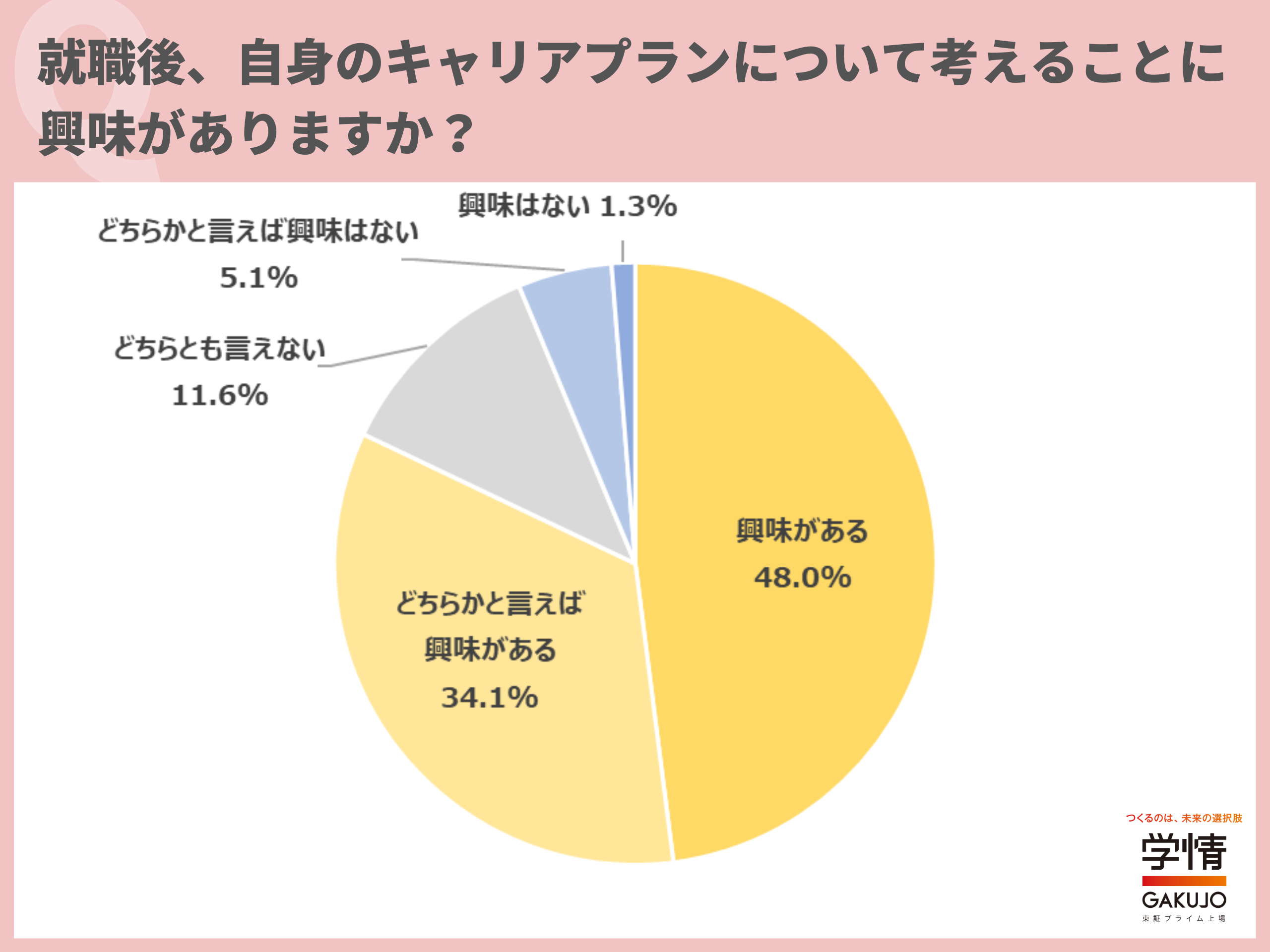 自身のキャリアプランを考えることに「興味がある」と回答した新社会人が48.0%に上りました。「どちらかと言えば興味がある」34.1%を合わせると8割以上の新社会人が、自身のキャリアプランについて考えることに興味があるとしています。「希望通りになるかは分からないが、どのようなキャリアを描きたいか考えることは大切だと思う」「キャリアを考えることは人生設計にも直結すると思う」「自律的にキャリアを形成しながら成長していきたい」といった声が上がりました。