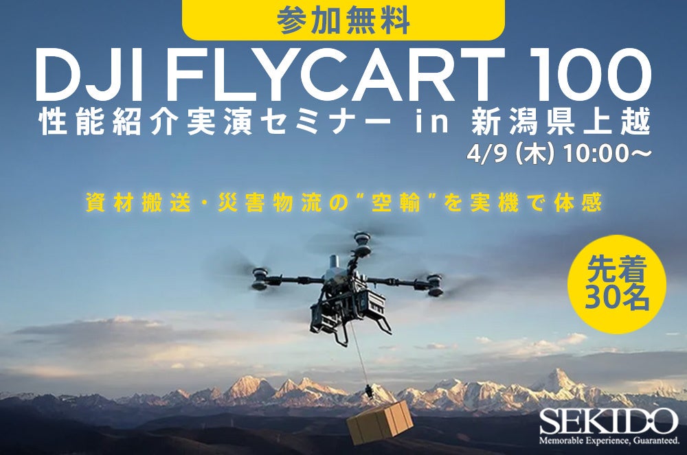 DJI(ディージェイアイ)正規販売代理店としてドローンビジネスの最前線を支える株式会社セキド(本社:東京都港区、代表取締役:大下貴之)は、株式会社フォト・オフィスオーツー(本社:新潟県上越市、代表取締役:大坪幸信)と共催で「【無料】DJI FLYCART 100 性能紹介実演セミナー」を2026年4月9日(木)に新潟県上越市で開催します。