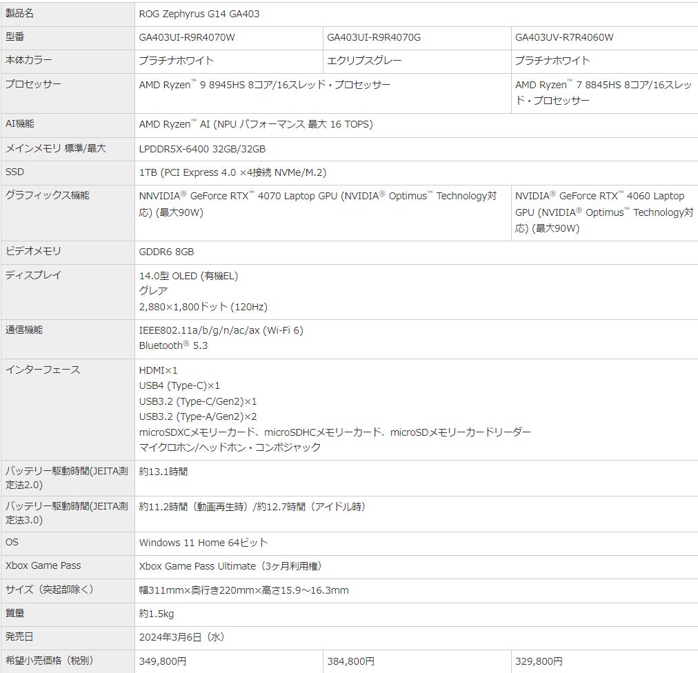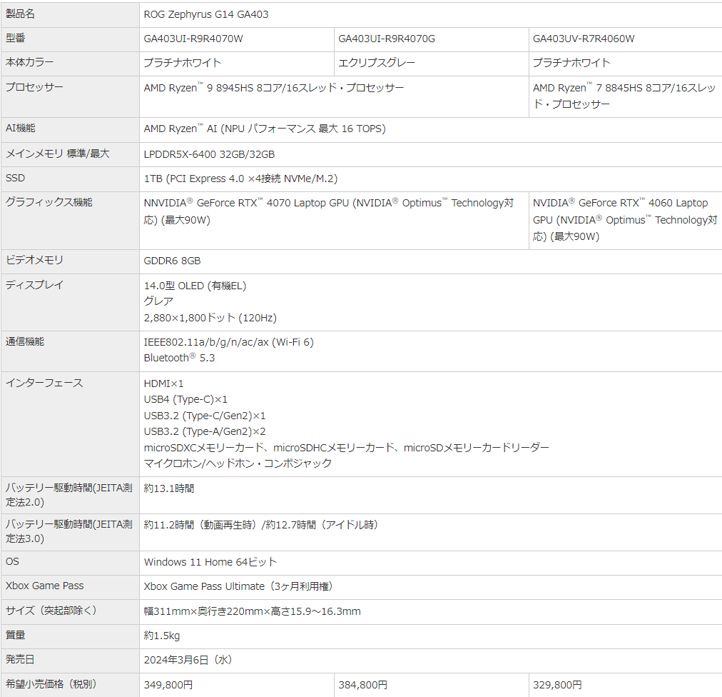 製品情報:https://rog.asus.com/jp/laptops/rog-zephyrus/rog-zephyrus-g14-2024/